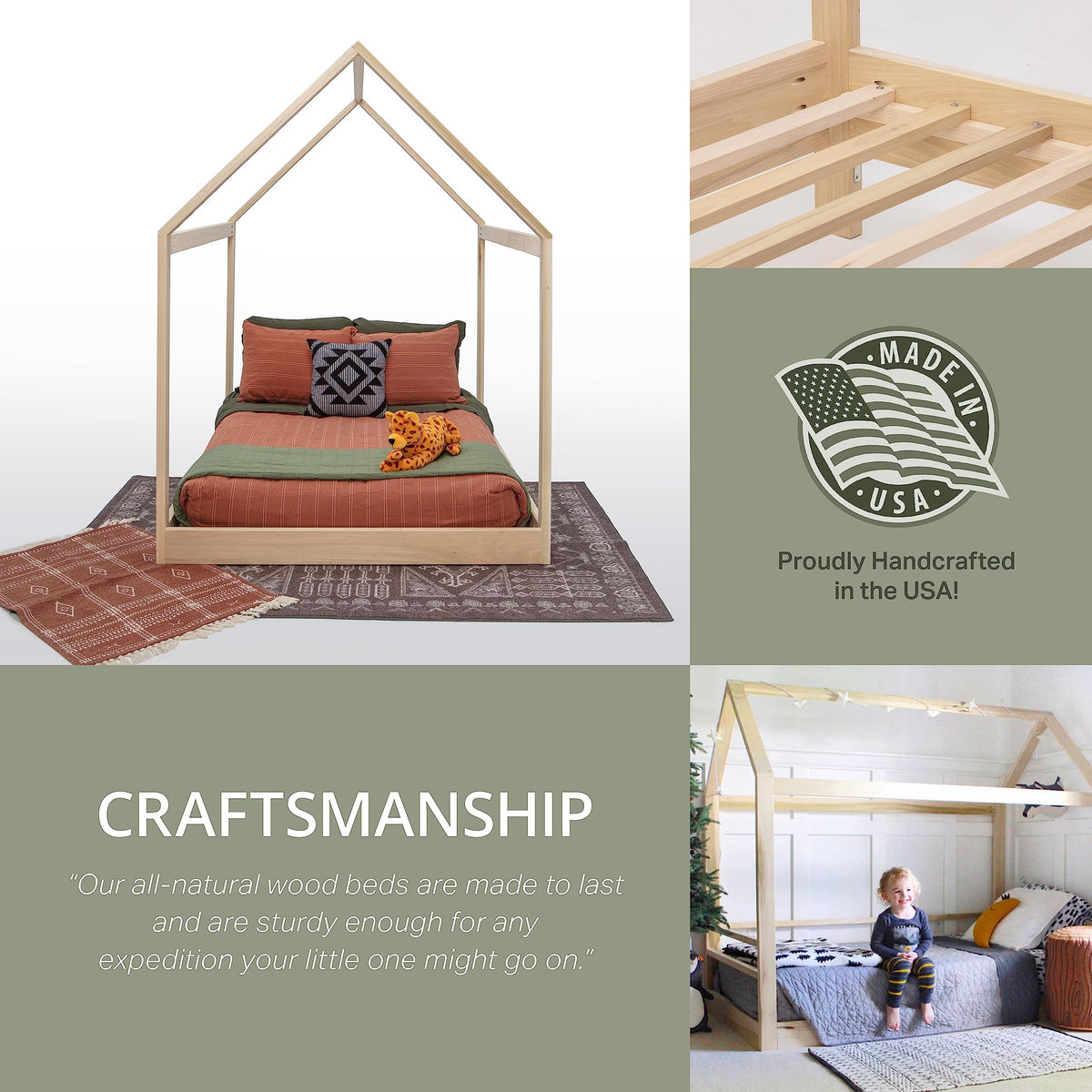 What a great functional piece for your kids room! Now they can have a home inside their home with this adorable house bed frame. Make the transition out of the toddler bed exciting for your little ones! This is a sturdy product made from unfinished solid knot free furniture grade poplar. You can stain or paint any color you wish or you can leave the item unfinished. Your bed purchase plants trees too! We plant one tree for every bed sold through One Tree Planted foundation! Available in twin, full and queen size.