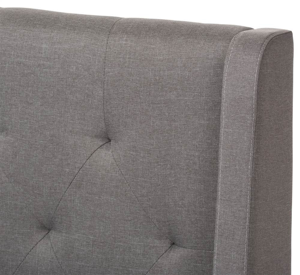 Resonate a resurgent aesthetic in your bedroom with the wingback frame and luxe upholstery of the Adelaide queen size platform bed. Constructed of solid wood and plywood frame with MDF for a strong and sturdy structure, the Adelaide features wood legs for ultimate sturdiness and a superior support structure. Upholstered in quality blend of polyester fabric with resilient quality to last over the padded bed frame, the wood slats provide ample support to your mattress while the structure is screwed together for stability. Attached headboard provides a supportive backboard to your bedding as well as a stylish button-tufting feature to give indulgent good looks to your bedroom. Wingback design for mid-century modern style-lines and tapered, natural finishing legs to give resurgent accents to your contemporary aesthetic. Cool chic hue in a light grey tone for effortless style to complement your modern bedroom with its lasting good looks. Made in Malaysia, the Adelaide requires assembly.