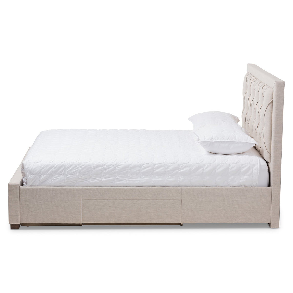 Being low on space doesn't mean you need to be low on style, and the Aurelie storage platform bed shows that. The modern and contemporary-inspired style is evident in the square headboard and neutral color. The Aurelie's headboard even has a touch of the luxe and glam look with it's foam-padded, button-tufted panel. The bed offers storage options with four convenient drawers in the base. Saving space and looking good are easy with the Aurelie's all-over fabric upholstery. This bed will be a delightful addition to your bedroom or guest room. The Aurelie is designed for use with one mattress only and comes with fourteen roller slats. Made in Malaysia, this storage platform bed requires assembly.Features Modern and contemporary storage platform bedLight beige fabric upholsterySquare headboard with padded, button-tufted panelFour drawersDesigned for use with mattress onlyAssembly requiredDimensions: 48.11" High x 62.6" Wide x 86.81" Deep; Headboard: 48.11" Wide x 62.6" Long x 2.76" Thick; Siderail: 12.01" Wide x 80.31" Long x 0.79" Thick; Footboard: 15.35" Wide x 62.6" Long x 3.74" Thick; Slats: 1.77" Wide x 60.51" Long x 0.71" Thick; Top of Slat: 12.05" High; Legs: 1.97" High; Footboard Drawers: 6.18" High x 24.25" Wide x 18.5" Deep; Siderail Drawers: 4.61" High x 29.76" Wide x 18.5"Deep; Inside Dimensions (Mattress Size): 60" Wide x 80" DeepSET INCLUDES: One (1) Queen Size BedSTYLE: ContemporaryCOLOR: Light BeigeMATERIAL:Fabric "Polyester 100%"/Rubber Wood/MDF/Foam