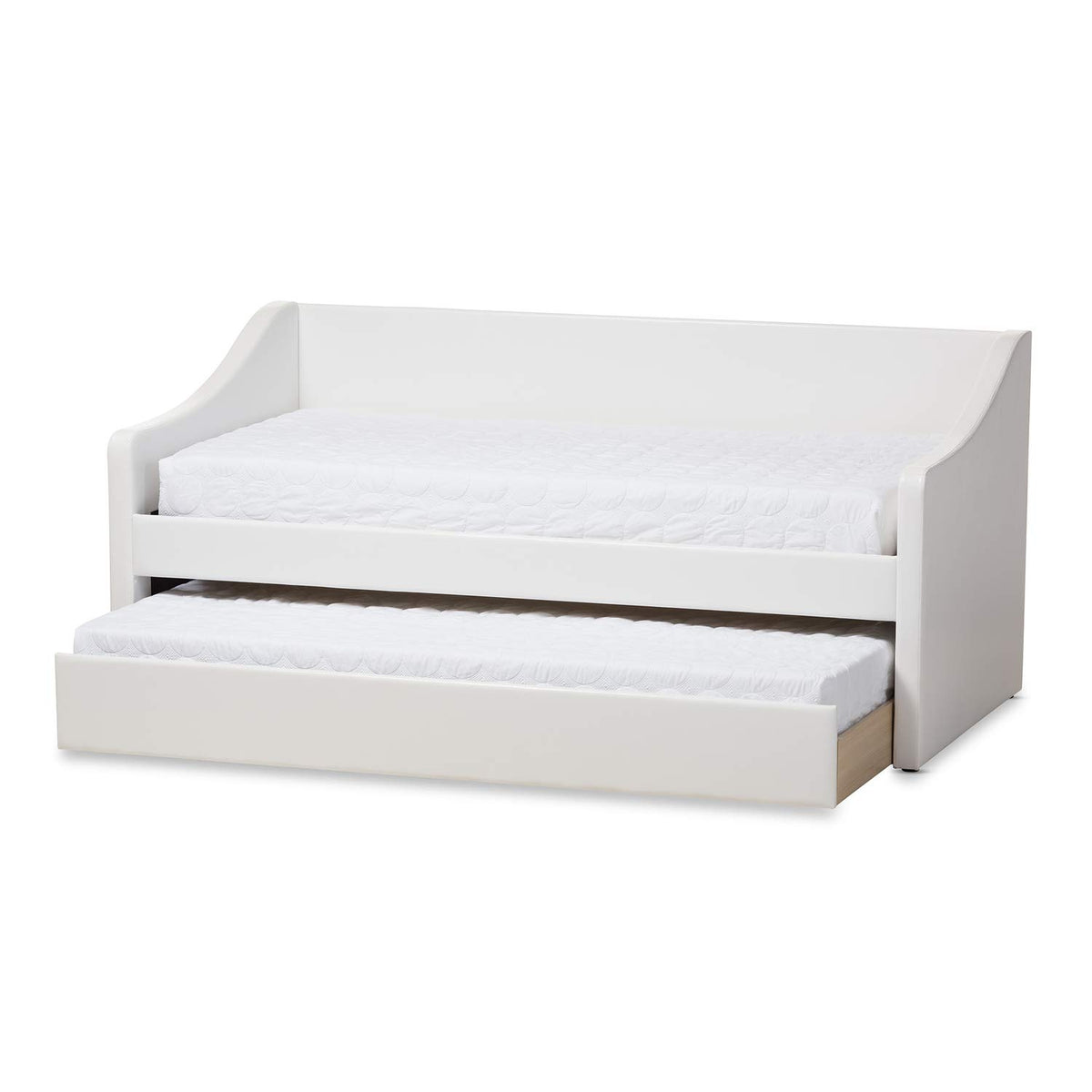 The Barnstorm modern and contemporary white faux leather upholstered daybed with guest trundle bed will help bring an understated but unmissable sense of contemporary taste to any modern interior. Covered in white faux leather, this sofa bed features a clean and distinct design that belies the high level of comfort offered. Constructed of hardwood, plywood and engineered wood, the Barnstorm is built too last. Featuring swooping arms, the Barnstorm is ideal as a daybed in its own while the wheeled trundle bed provides an additional sleeping space for your guest. Offering a number of different styling solution, this versatile 3-in-1 furniture multitasks as a daybed, sofa and guest bed. For studio apartment and condominium where space is limited, the Barnstorm could be your reading nook during the day time while transforming into your guest bed for two by rolling out the trundle. In your living room, family room or home office, the daybed is a good option for extra seating space during day time while transforming into guest bed for two at night. Made in Malaysia, the daybed requires assembly.