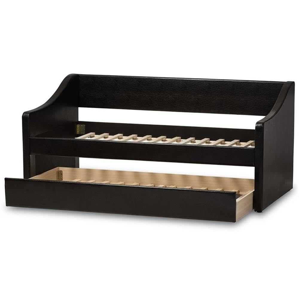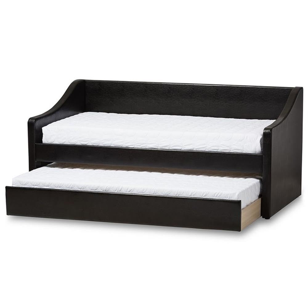 The Camino modern and contemporary white faux leather upholstered daybed with guest trundle bed is all about refined comfort and adding an element of style to your home while also providing an ideal place to unwind, lounge or relax. Constructed of solid wood frame and upholstered in white faux leather, these elements give the daybed a stylish look. The Camino is all about delivering comfort and has been fitted with a generous high density foam filling to ensure the most comfortable space possible. The daybed also features flared arms with camel-shaped back panel, for an extra element of style and comfort. Offering a number of different styling solution, this versatile 3-in-1 furniture multitasks as a daybed, sofa and guest bed. For studio apartment and condominium where space is limited, the barnstorm could be your reading nook during the day time while transforming into your guest bed for two by rolling out the trundle. In your living room, family room or home office, the daybed is a good option for extra seating space during day time while transforming into guest bed for two at night. Made in Malaysia, the daybed requires assembly.