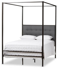 Featuring Modern And Contemporary Style, The Eleanor'S Clean Lines Are A Streamlined Update To A Traditional Four-Poster Shape. Constructed Of Tubular Metal Frame, The Eleanor Is Upholstered With Padded Cushion For Your Leaning Comfort. To Keep Up With Style And Character, The Eleanor Showcases Button-Tufting Design To Capture All Of The Eyeballs With Its Grey Polyester Upholstery. The Box Frame Floats On An Airy Space, Providing Substantial Storage Space For Your Bedroom Clutters Under The Bed Base. Four Metal Bars And Metal Legs Supporting The Bed Base For A Strong Structure. To Complete This Canopy Bed Frame, You Will Need A Us Standard Size Box Spring And Mattress. Made In Malaysia, The Eleanor Requires Assembly.Features Vintage Industrial Metal Canopy Queen Bed Black Finishingpadded Headboard In Grey Polyester Fabricmetal Composition Platform Bedmattress Not Includedmade In Malaysiadimensions: 90" High X 62.52" Wide X 83.31" Deep; Headboard: 90" High X 62.52" Wide X 1.5" Thick; Siderail: 1.97" High X 80.31" Long X 0.98" Thick; Footboard: 90" High X 62.52" Long X 1.5" Thick; Legs: 12" High; Inside Dimensions (Mattress Size): 61.02" Wide X 81.5" Deepset Includes: One (1) Queen Size Bedstyle: Vintage Industrialcolor: Blackmaterial:Metal