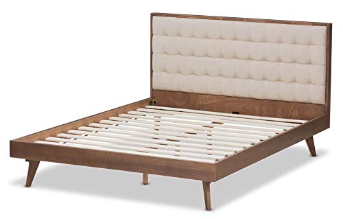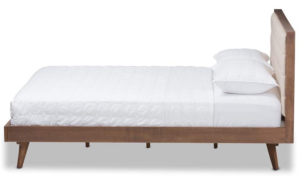 Fans of the retro look will love the Soloman platform bed with its sleek, low line design, angled wood legs and luxurious fabric upholstery finish. Durable rubberwood frame and legs support the bed base for a reliable and strong hold while you sleep. Upholstered in beige fabric for a soft and a lightly textured feel, the Soloman features grid tufting design for grandeur detail and added elegance to your bedroom look. Understated rectangular cuts ensure a timeless, sophisticated style with modern edge. Neutral beige tone complements various bed linens and color schemes for a complete design in your bedroom. Walnut finishing wood frame exudes extra warmth for a conducive sleeping zone. Perfect for you to lean back on as you sit up in bed with a good book. Made in Malaysia, the Soloman platform need requires assembly.Features Mid-century platform bedLight beige fabric upholsteryGrid line tufted headboardWalnut wood finishingAngled wooden legsMade in MalaysiaAssembly requiredDimensions: 41.34 High x 78.74 Wide x 84.65 Deep; Headboard: 32.87 Wide x 78.54 Deep x 3.54 Thick; Siderail: 4.72 Wide x 81.1 Deep x 0.98 Thick; Footboard: 4.72 Wide x 78.74 Deep x 0.98 Thick; Slats: 2.48 Wide x 76.38 Deep x 0.55 Thick; Top of Slat: 11.42 High; Legs: 9.84 High; Inside Dimensions (Mattress Size): 76 Wide x 80 DeepSET INCLUDES: One (1) King Size BedMATERIAL: Fabric Linen Polyester 100%/Rubber Wood/MDF/FoamCOLOR: Light Beige/Walnut Brown