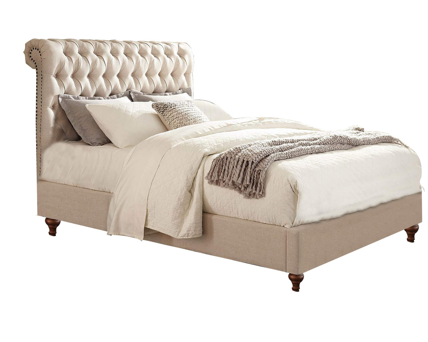 This Queen Size Bed Is Draped In Fabric That Features Diamond Button Tufting And Individual Nail Head Trim. Furthermore, Details Like Rolled Headboard Design And Turned Legs Provide Elegance That Bring This Bed Above And Beyond The Competition. Note: Other Featured Items In Image Except This Bed Are Sold Separately.