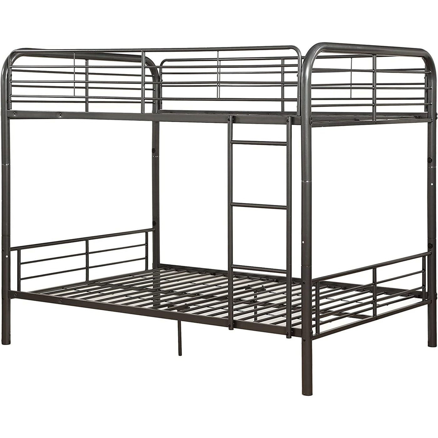 This Metal Full Over Full Bunk Bed Features Convertible Design Which Allows To Transform The Stacked Bed Into Two Single Beds, Superior Quality Metal For Durability, Reversible Front Ladder, And Full Length Guard-Rails For Safety.
