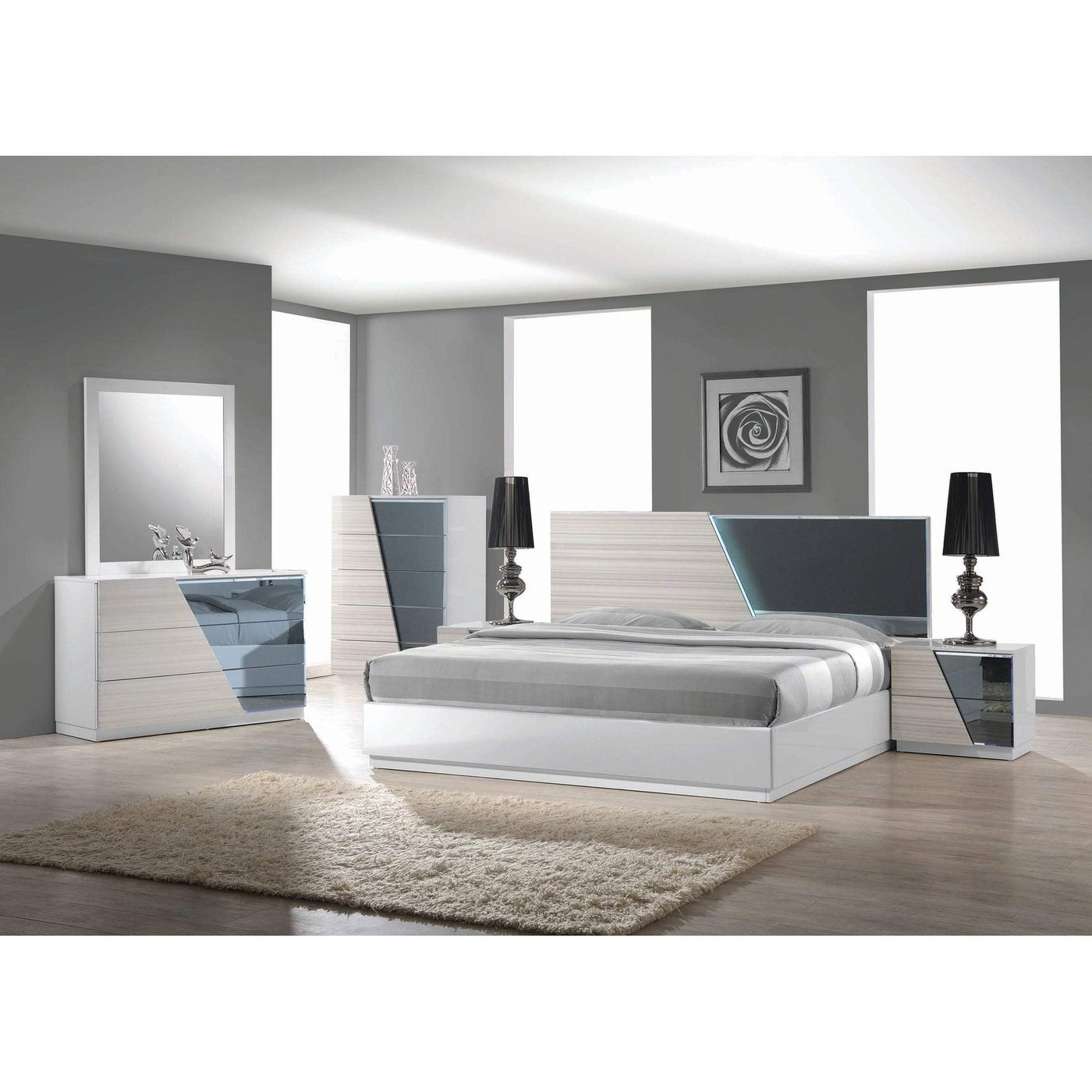 This Manchester Platform Bed Has All You Need For The Modern And Contemporary Look. It Comes In High Gloss Zebra White Lacquer With Wooden Slats. Therefore, There Is No Need For A Foundation Or Box Spring. The Diagonal Portion Is Light Blue/ Green Color Mirror. This Is Great For Those Looking To Add A Sleek Design Into Their Bedroom.Features:Finish: Zebra Graymaterial: Poplar Wood, Engineered Wood, Lacquer, High Glossincludes Headboard, Footboard, Side Panel, And Slatsassembly Is Requiredzebra Gray With White Lacquer Finishspecifications:Bed Dimensions: 84"L X 88"W X 44"Hweight Capacity: 500 Lbssurface Material: Poplar Wood, Engineered Wood, Lacquer, High Gloss With Extra Coating