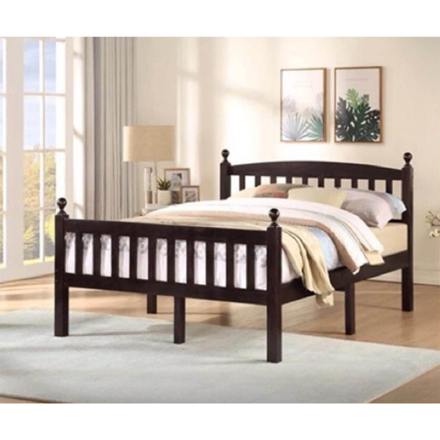 Add a touch of mid-century to your bedroom with the Better Home Products Paloma Solid Wood Pine Full Bed with Headboard. This classically designed sturdy bed frame offers superb style with stated headboard and footboard that will easily complement any d?cor. Crafted from solid pine and presented in a luxurious paint finish bring attention to the vertical spindles accenting the curved headboard and sleek footboard for a truly versatile look. The Paloma is designed to support your mattress and doesn't require a box spring underneath thanks to reliable engineered wood slats. Nine legs touching the floor ensures both comfort and durability. What could possibly make this pine bed better? All the tools, parts and instructions you need are packed up and shipped straight to your door in one box for super simple assembly. Available in Natural, Mahogany and Tobacco color options.