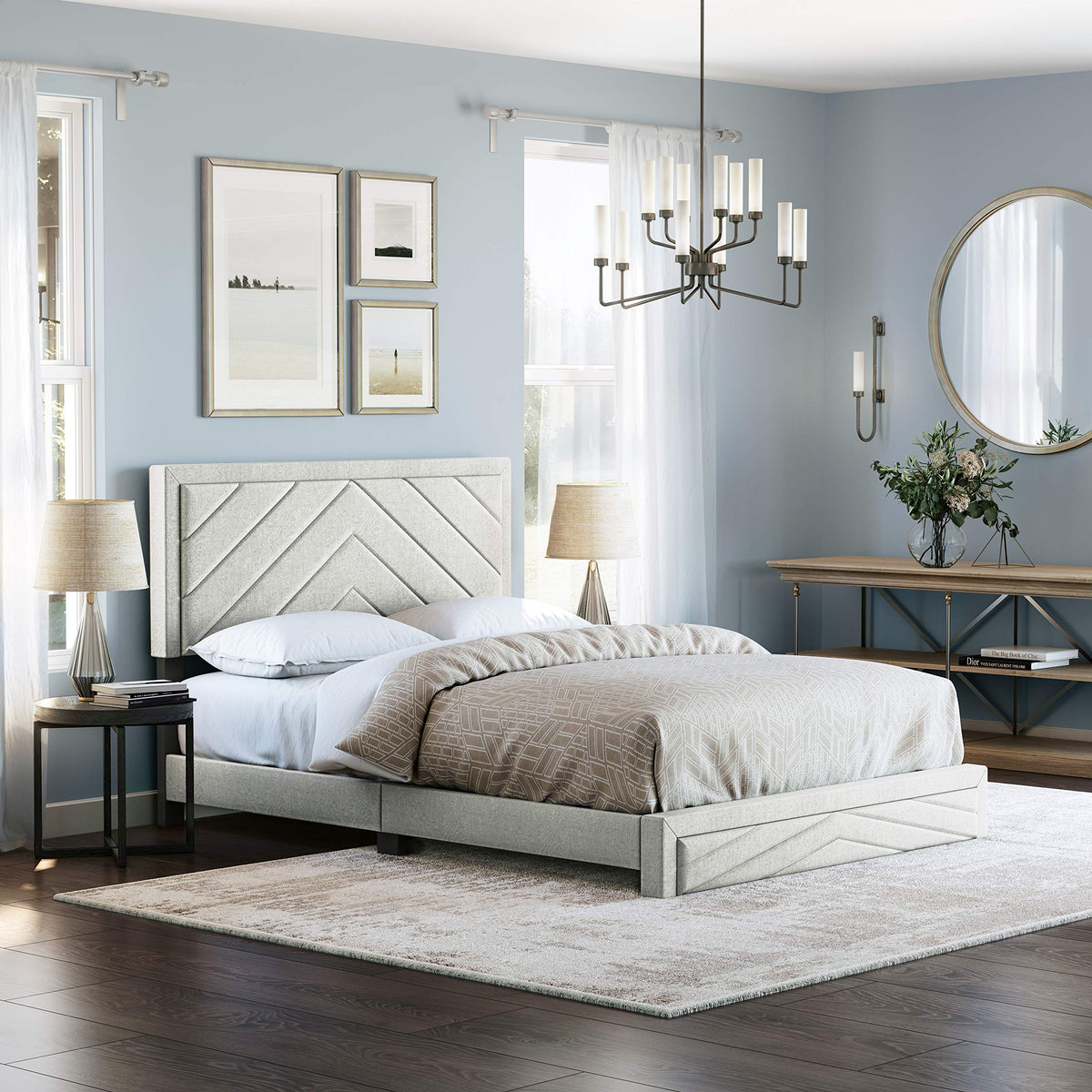 The Barcelona Upholstered Linen Platform Bed Frame is ideal for any contemporary styling. This platform bed showcases architectural stitching in beautiful chevron patterns on both the headboard and footboard. The Barcelona upholstered platform bed is not only supportive due to its 14 slat system, but it has a unique footboard that extends to the floor. Simple and easy to assemble, the frame goes from box to built in just a matter of minutes.