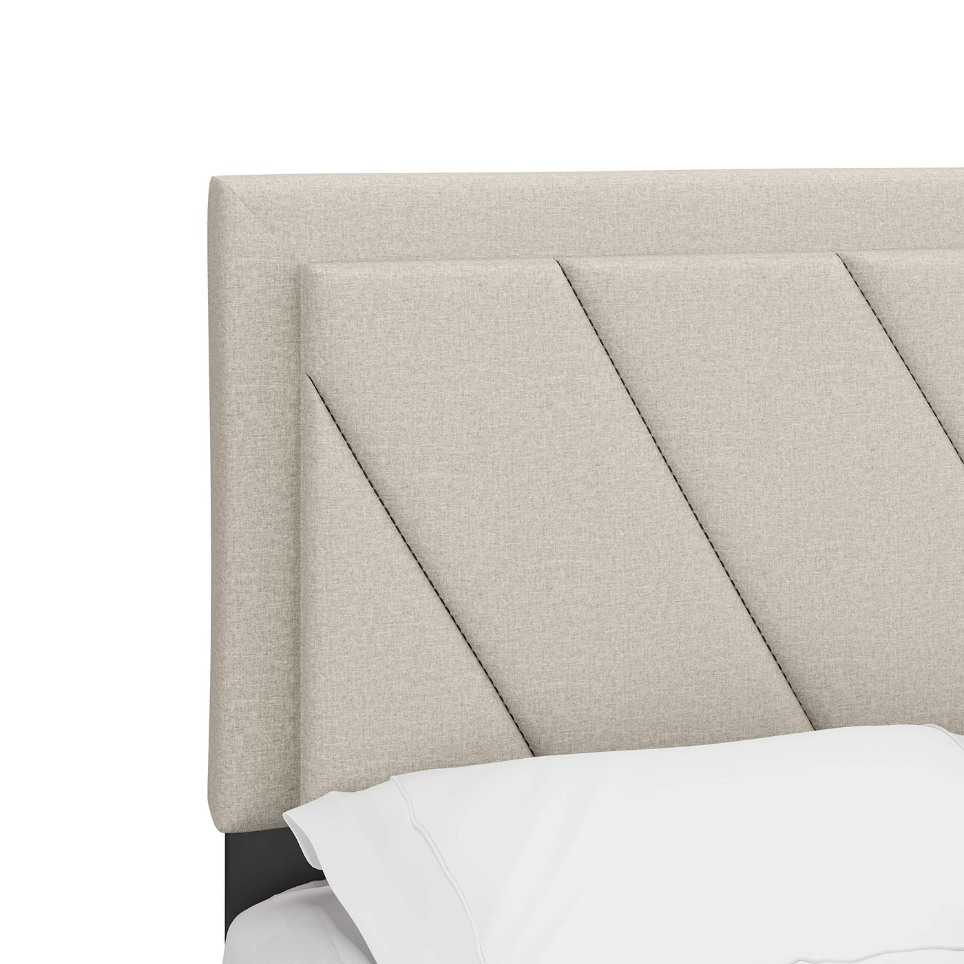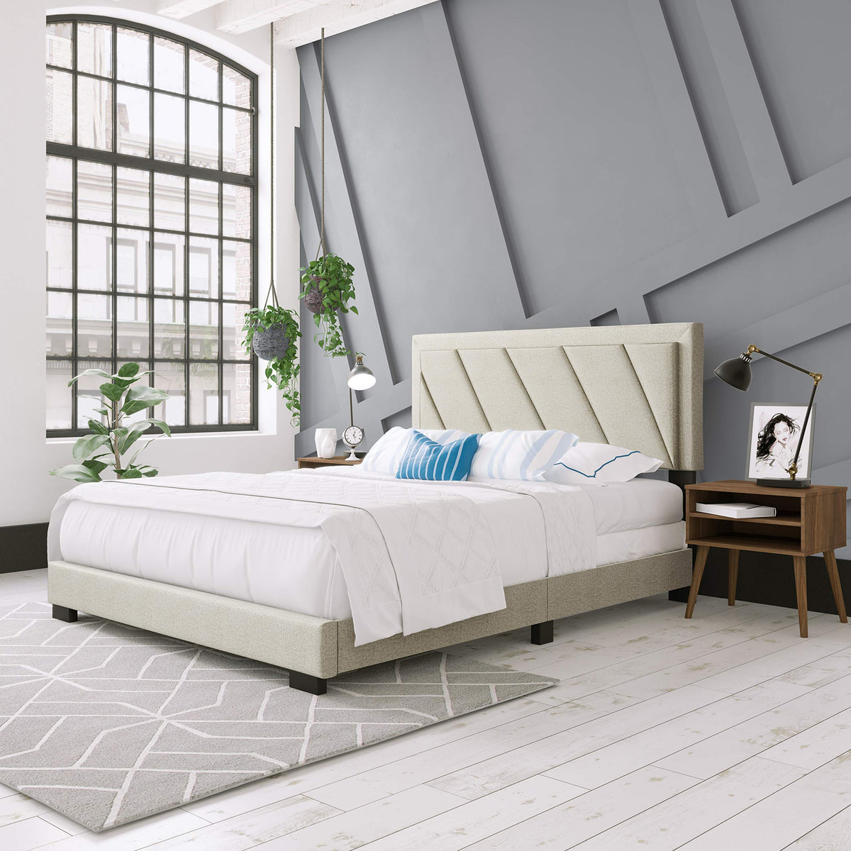 The Diagonal Upholstered Linen Platform Bed features graduated stitching detail with a diagonal design on the headboard. Available in a blue/gray or white-black stitching color combinations, this upholstered platform bed will bring timeless elegance to any bedroom. Its graceful simplicity will make it easy to pair with any decor. Conveniently shipped in a single box, you’ll have this bed made up in no time.