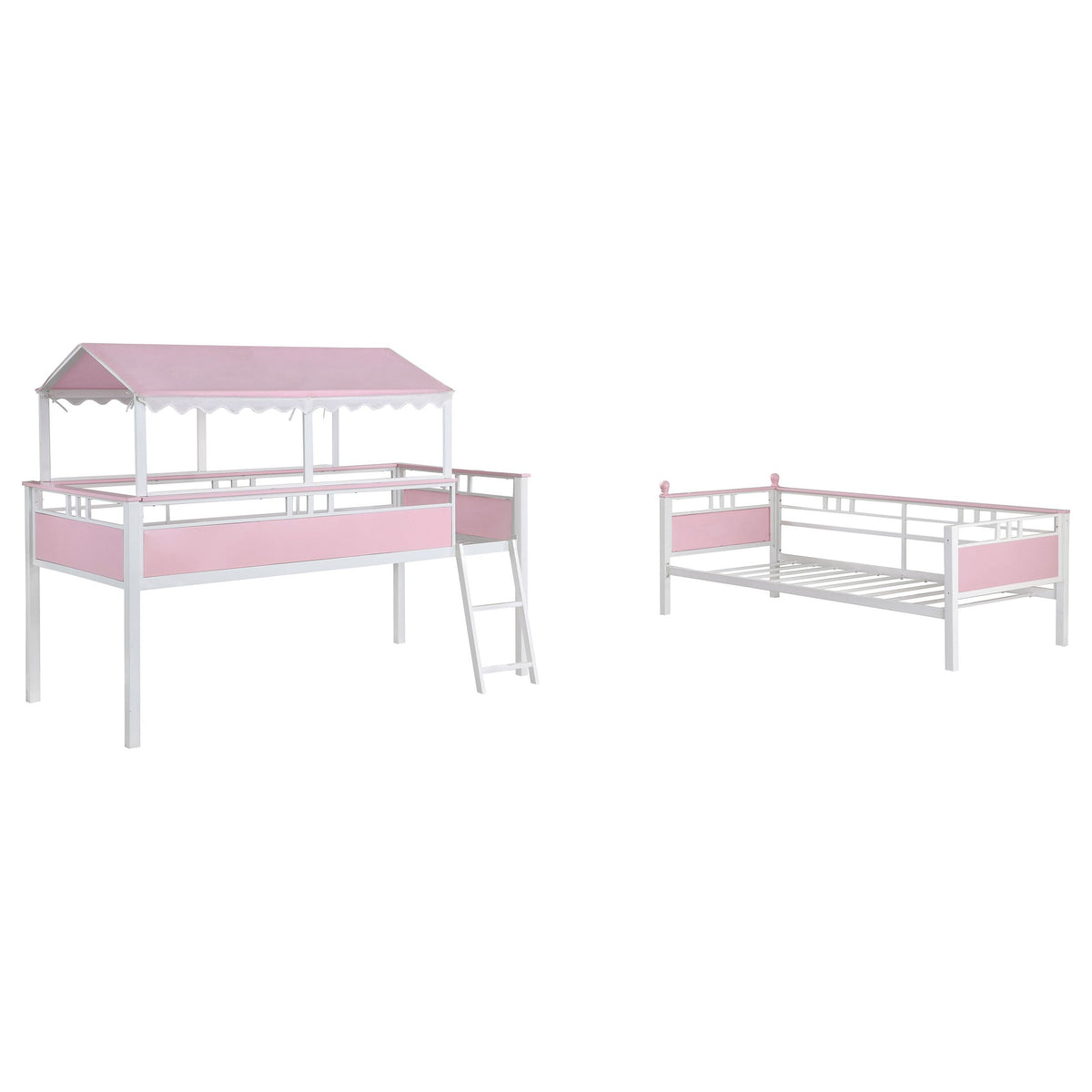 Your little one will work hard and sleep soundly with this twin over twin workstation loft bed. Made from steel and composite wood planks, this workstation loft is finished in a sweet combination of pink and white. The bottom bunk features a twin bed with a shelf to serve as a workstation, leaving room for items such as books and a laptop. The top bunk has a unique tent design that little ones will love. Watch this pink and white workstation loft become the main attraction in your little one's bedroom.FeaturesSave space and make a whimsical statement with this beautiful heavy duty workstation bunk bed Steel frame powder coated in white with composite wood panels finished in pink Top bunk with a pink polyester fabric canopy, an enclosed bottom daybed, and a built-in workstation desk offers a cozy retreat Guardrails on both beds and angled ladder for safety Separates into a twin loft bed and twin daybed Frame constructed with heavy gauge steel tubing, MDF, and engineered laminate Easy-to-assemble steel foundation includedDimensions:Bunk BedAssembled Product: 79.25 inches wide x 78.5 inches deep x 91 inches high Weight Capacity: 400 poundsAt Coaster, we are your premier source for exquisite furniture, offering diverse styles to enhance every aspect of your life. Our passion for excellence drives us to innovate, crafting budget-friendly furniture that complements your lifestyle. Explore our brands for endless design inspiration and make your living experience exceptional with thoughtfully designed, affordable pieces that inspire a life well-lived.