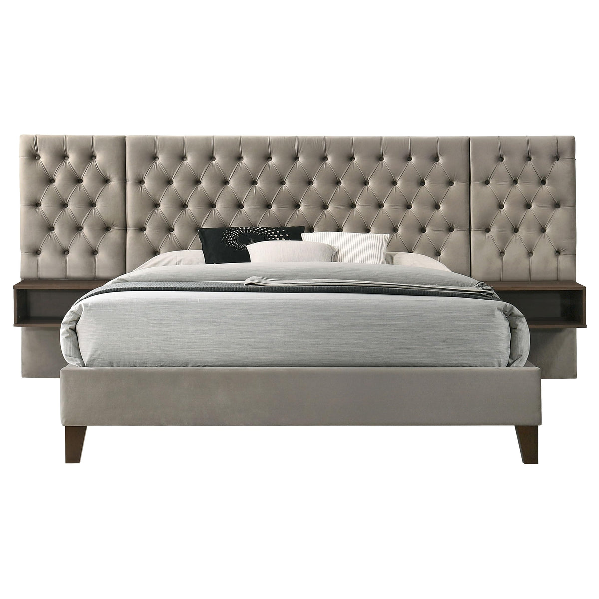 Upgrade to the refined style and inviting sophistication of a modern upholstered bed. Designed to impress while offering a welcoming retreat from the world, the bed features light brown fabric with deep button tufting in a diamond pattern that creates wonderful texture and dimension. The three-panel design includes floating nightstands, ensuring bedside storage while maintaining a light, airy ambiance in your bedroom. The nightstands are open cubes, each in a rich brown finish with a wood look, perfectly complementing the silhouette of the bed. Classic upholstered rails complete the look while tapering legs ensure support and stability.
