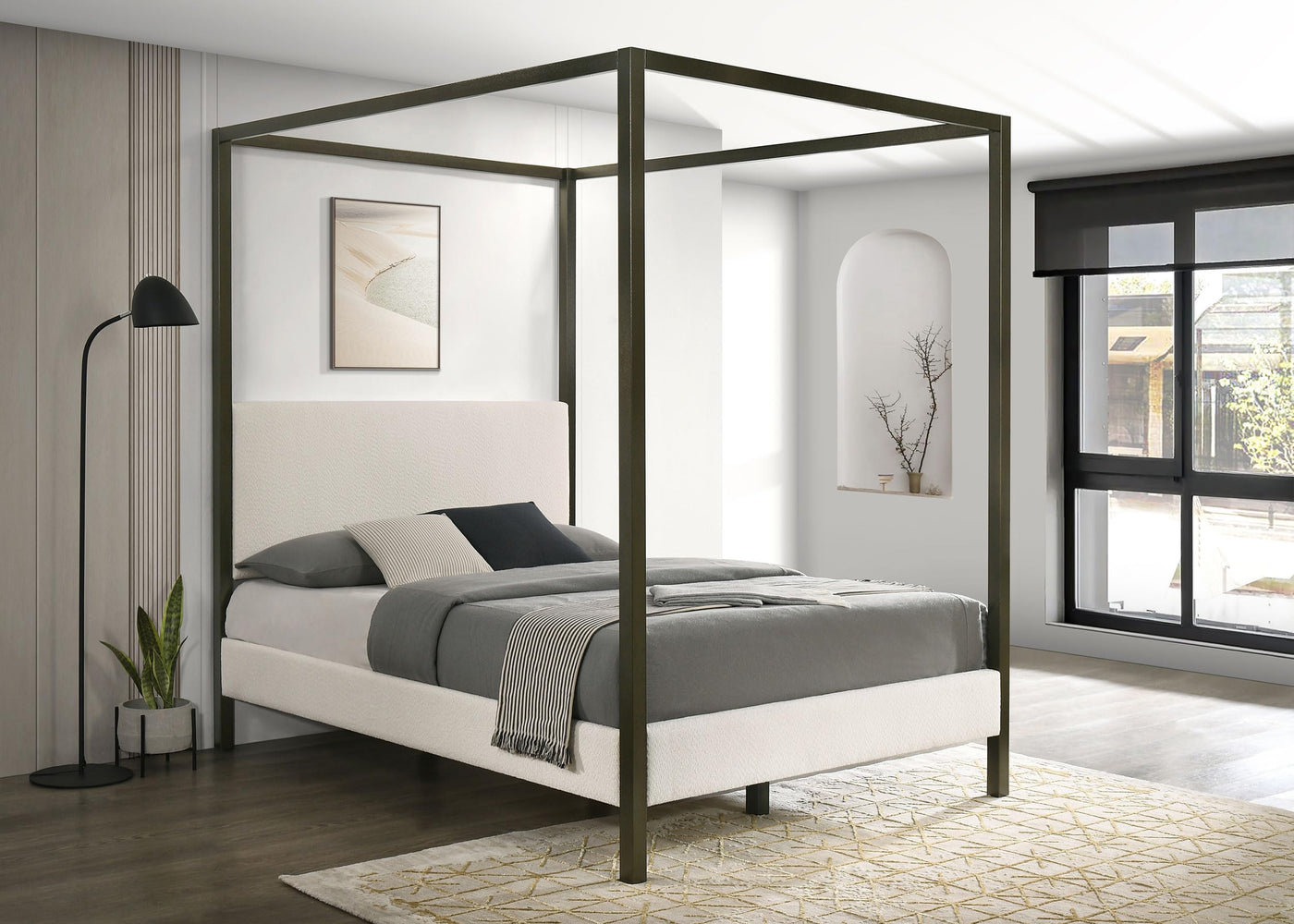 Bring refined style and character to your bedroom with a contemporary upholstered bed. An instant focal point, it features a clean-lined silhouette with a padded headboard and rails and a four-post canopy frame that creates gravitas. The frame adds a bronze finish that assures it stands out, while soft vanilla fabric is light and warm for an inviting finishing touch. Its engaging frame adds height to your bedroom with its open canopy and slim posts, perfect for blending modern and traditional design elements. The bed includes wooden slats and three additional center support legs to ensure strength and stability for lasting enjoyment.