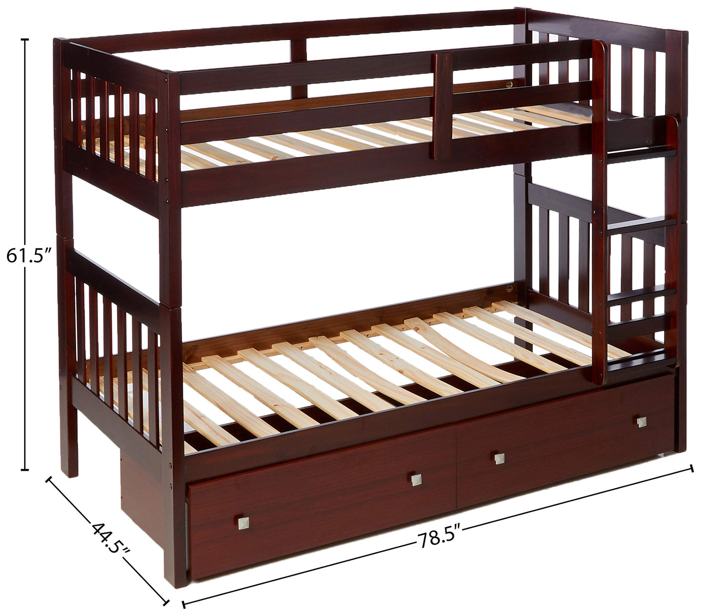 The stylish design of the mission bunkbed will give your child years of enjoyment. The dark grey finish pairs well with any décor. The solid pine construction of this bed provides outstanding durability. Also included are dual storage drawers for added space saving options.