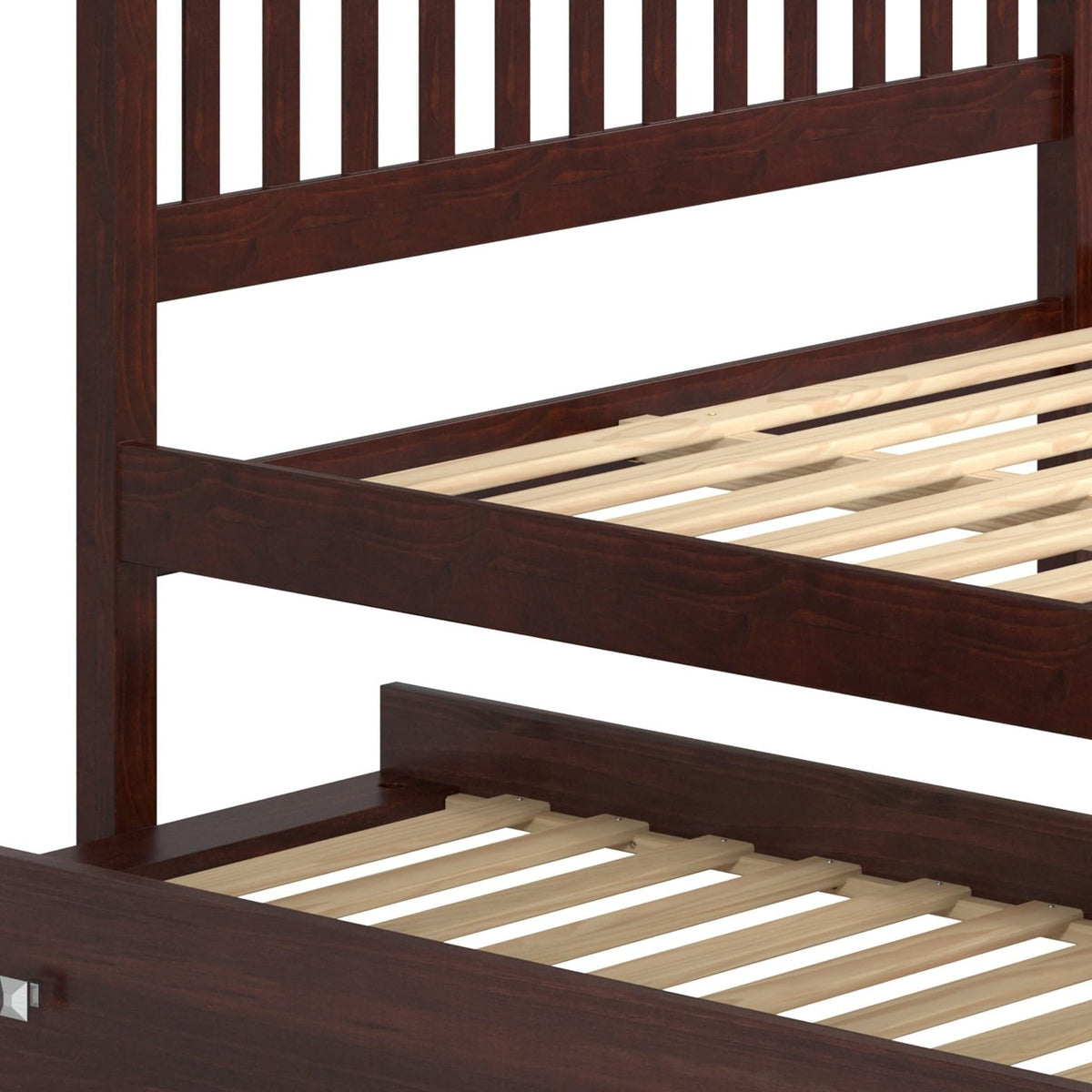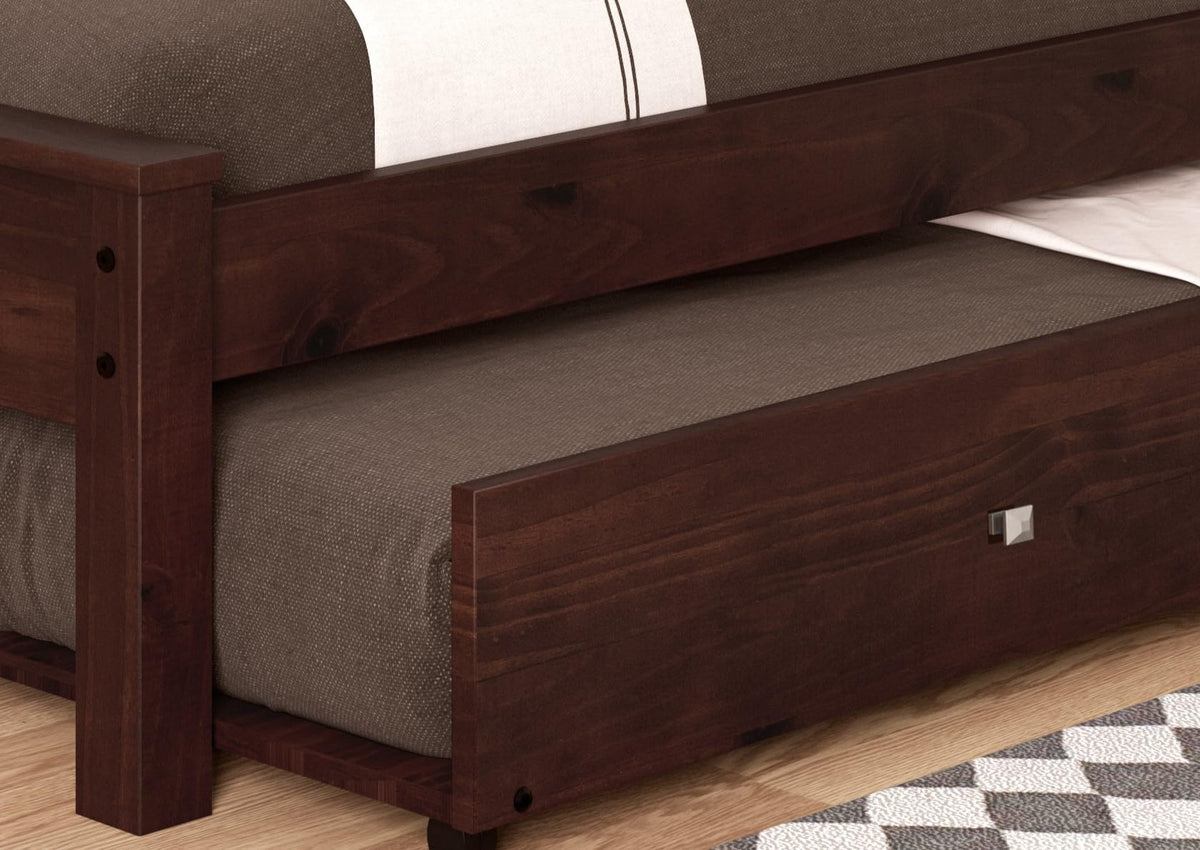 Discover The Epitome Of Childhood Dreams With Donco Kids' Mission Dark Cappuccino Full Bed And Twin Trundle. Crafted From Solid Pine Wood, This Bed Exudes Timeless Elegance With Its Cappuccino Finish, Blending Seamlessly Into Any Decor. The Mission Design Lends A Touch Of Sophistication To Your Child'S Haven. Engineered For Longevity, The Mattress-Ready Slat System Ensures Durability Without The Need For Box Springs Or A Bunkie Board. Embrace The Joy Of Space-Saving Convenience With The Pull-Out Trundle, Providing A Cozy Spot For Sleepovers Or Sibling Bonding. Gift Your Child A World Of Comfort And Style, A Bedtime Story In The Making.