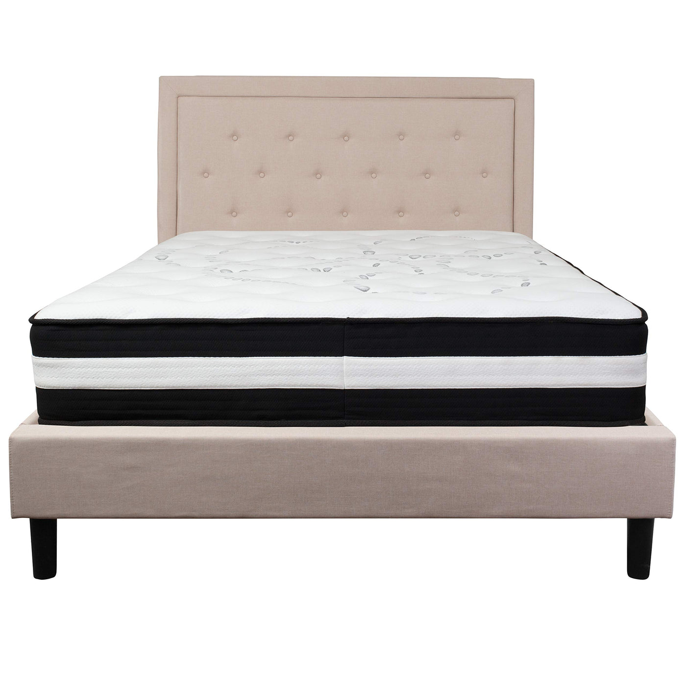 Flash Furniture Roxbury Queen Size Tufted Upholstered Platform Bed In Beige Fabric With Pocket Spring -Mattress
