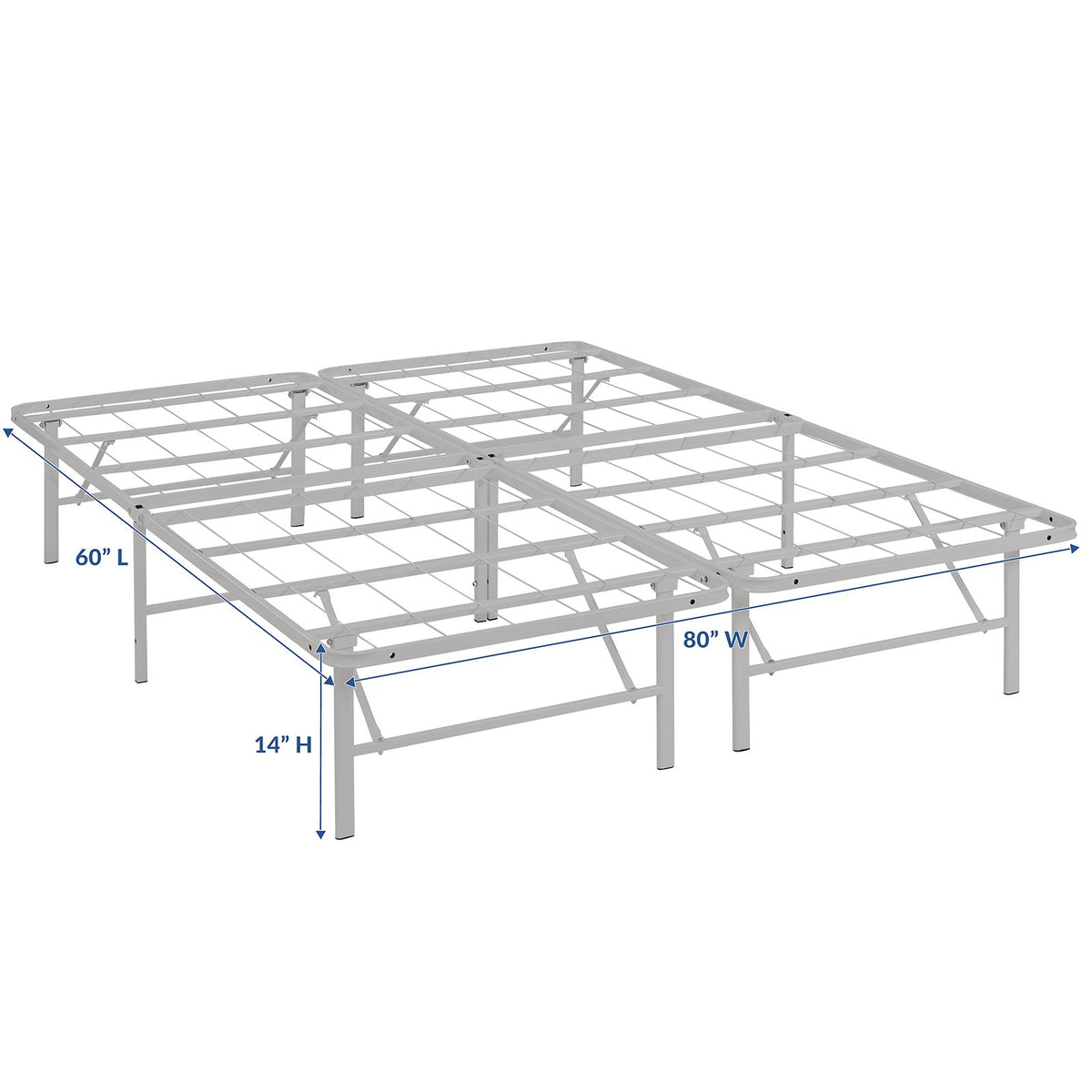 Sleep Better With The Horizon Metal Bed Frame. Horizon Is Made With A Reinforced Stainless Steel Metal Base For Long-Term Comfort And Use With A Generous 14 Inches Of Space Underneath To Store Hobby Collections Or Seasonable Clothing Bins. Horizon Comfortably Supports Up To 1300 Lbs, Easily Folds Away When Not In Use, And Eliminates The Need For A Box Spring With Its Heavy Duty Platform Frame Construction. Complete With Non-Marking Foot Caps To Keep Your Carpets And Floor Safe, Horizon Is A Low Profile Modern Bed Frame That Supports The Standard Mattress Types On The Market: Memory Foam, Spring, Latex Or Hybrids. Available In Twin, Full, Or Queen, Horizon Reduces Annoying Squeaks And Unpleasant Bending Or Buckling, While Transforming Your Home Decor With A Selection Of Stylish Color Options. Designed To Provide Lasting Support For Years To Come, Horizon Prevents Saggy Mattresses, And Increases The Mattress Lifespan While Delivering A Better-Made Bed Frame Solution For Your Home. Mattress Not Included. Set Includes: One - Horizon Queen Bed Frame Product Dimensions: Overall Product Dimensions: 60"L X 80"W X 14"H