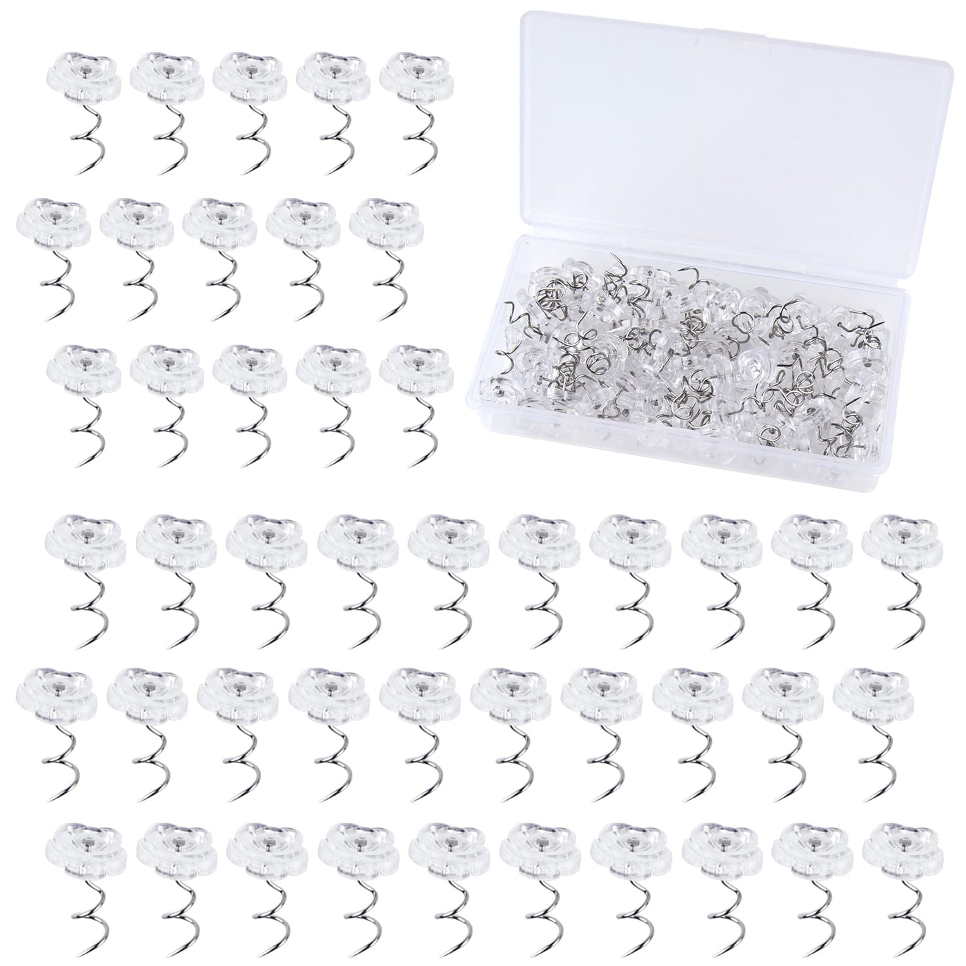 Neburora Upholstery Twist Pins Clear Rose Heads Design; Specifications: Material: Plastic Heads, Steel Pin Color: Clear Designs: Rose Shape Diameter Of Head: Approx 0.47 Inch/ 12Mm; Length Of Screw Pin: Approx 0.67 Inch/ 17Mm; Quantity: 100Pcs With Storage Box; Features: -Easy To Use And Remove; -Keep Slipcovers And Arm Covers In Place; -Suitable For Medium To Light Weight Fabrics, Bedskirts, Slipcovers, Upholstery And Bed Ruffles; -Wide Applications For Upholstery, Car Headliners, Photo And Art Pin; Notice: The Pin Is Sharp Parts, Keep Away From Kids, And Please Pay Attention To Safety;