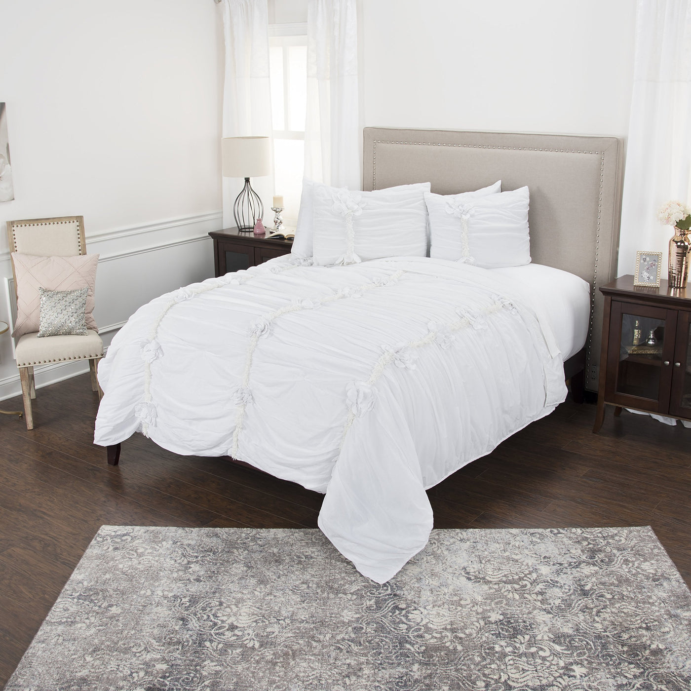 Ruching, cotton dimensional flowers - each petal hand stitched and applied - and cotton fringing make Aiyana a delightfully textural technique piece. Rows of hand applied embellishments make this quilt not only a work of art but beautifully appointed for any decor and any style genre where drama and fashion are center stage. Matching shams are split in the back for ease of fill. The inside backs of the shams are interlined for stability of the pattern application and for wearability. The patterning is asymmetrical on the shams for impactfulness allowing that patterning to not be lost when layered with additional shams or design elements. NONE