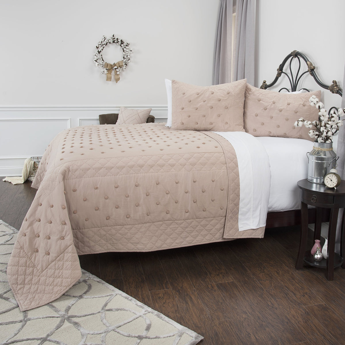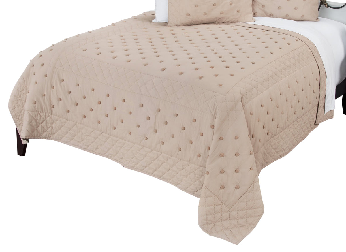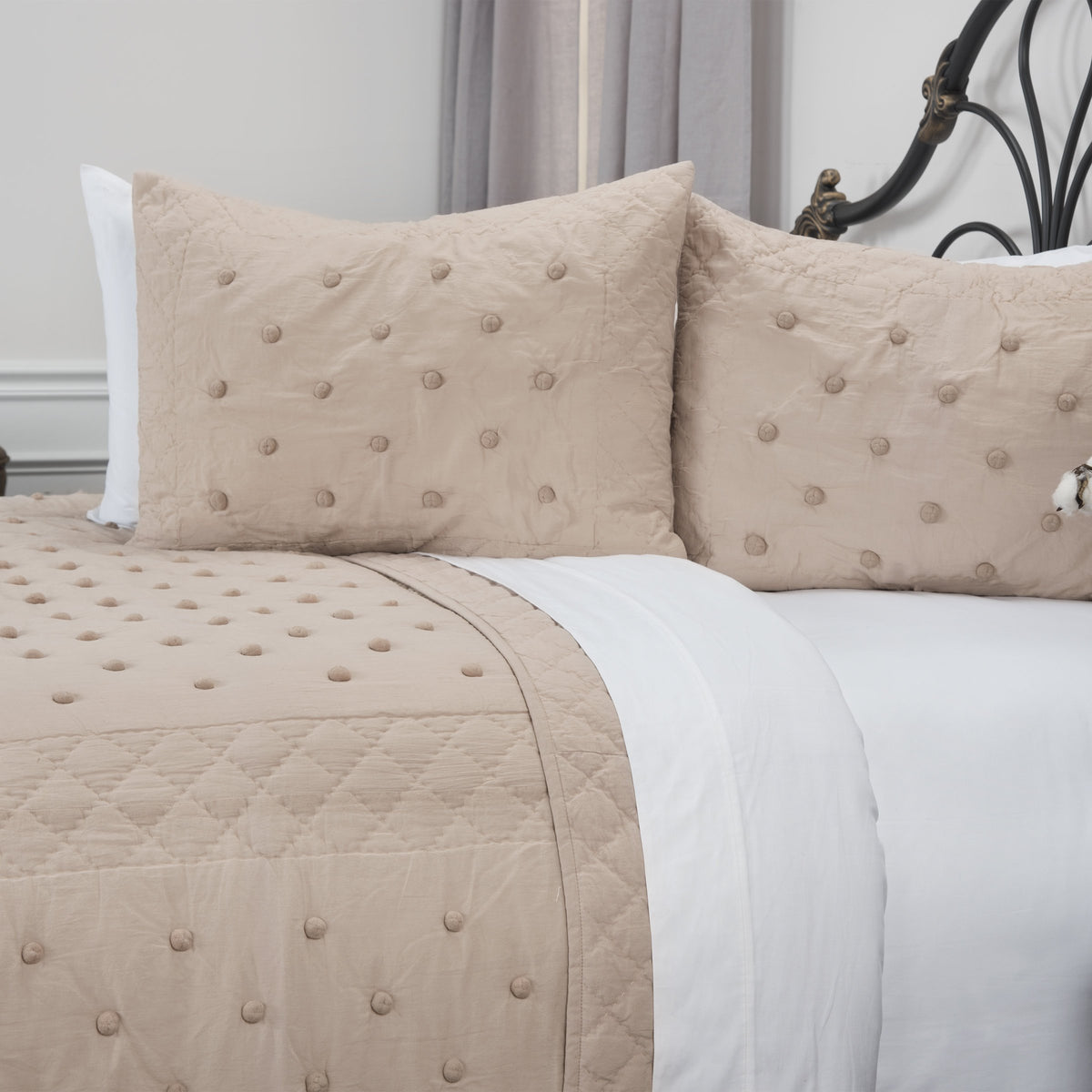 Vivian Rae is a flirty throwback to the 1950's polka dotted prints. The pom poms on the tonal background make a fashion statement and can be fun when paired with bright as a throwback or can be minimalistic art Deco and contemporary when incorporated into a minimalistic living environment. The cotton voile base back and front is very skin friendly. This piece requires care in laundering. The pom poms are configured in a blocked frame pattern. Pom poms are also applied to the shams. The shams are split in the back for ease of fill. None