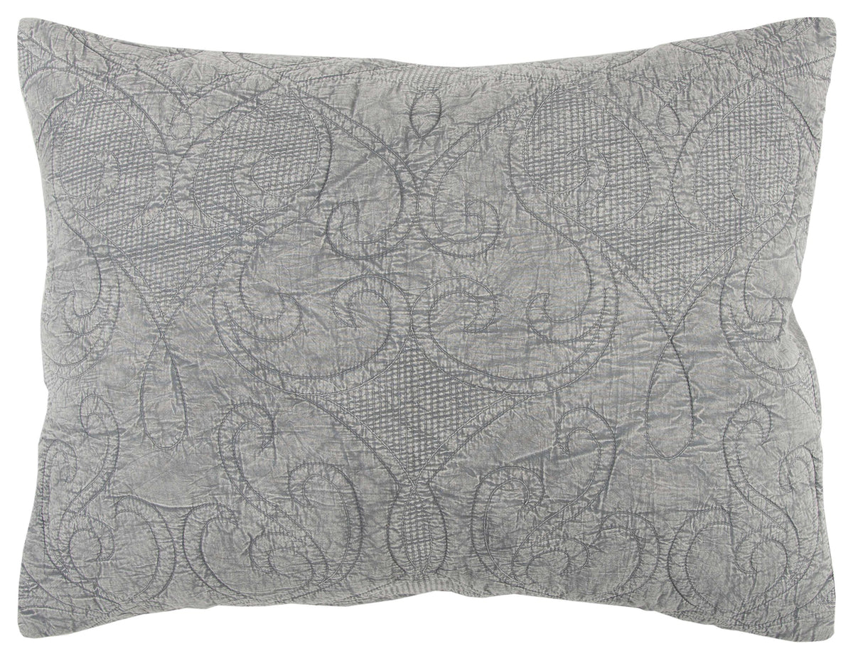 Beautifully complex stitching pattern on cotton chambray emulates a woven jacquard pattern but builds in complete reversibility making Anthony flappable. This machine stitchery allows patterning that is crinkled and will not be compromised with wear and laundering. Matching shams are split in the back for ease of fill. This quilt is a wonderful utilized as an accent, as a top of bed, or as an over scaled throw or coverlet. None