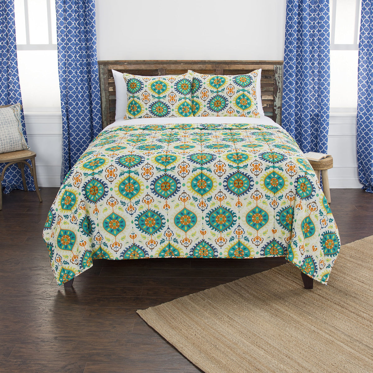 Geometrics that are bold and decisive. This pattern is a fun-loving play on patterning and coloration. The golds accent beautifully the varying shades of blue and indigo that make this quilt a delightful addition to any transitional decor. This quilt can be a standalone bed covering, as an accent quilt or an abundantly proportioned throw. Matching shams feature a split back for ease if fill. This print on voile is hand quilted for a handcrafted appeal. Combining a sophisticated retro sensibility with a chic contemporary polish, Rizzy Home bedding has a fashionable aesthetic all its own. Featuring a wide range of collections in a variety of colors, patterns and constructions, Rizzy Home bedding is sure to have a design suited especially to your personal taste and style. Specializing in convenient duvet bed in bag sets that contain everything you need to create your own beautifully coordinated bedding ensemble, Rizzy Home will transform your bedroom with a fresh new look. With its fun vintage style and casual elegance, bedding by Rizzy Home is a welcome addition to any bedroom.