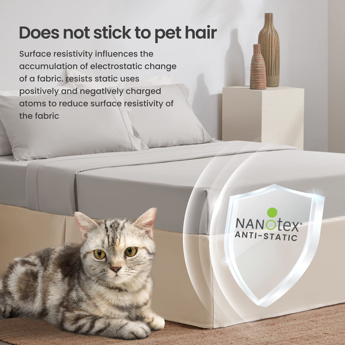 Q: How does the anti-static technology in this bed skirt work?A: The bed skirt features NANOTEX static-resistance technology that effectively blocks dust and prevents hair, pet hair, and other particles from adhering to the fabric. This keeps your bedding cleaner and reduces allergens.
