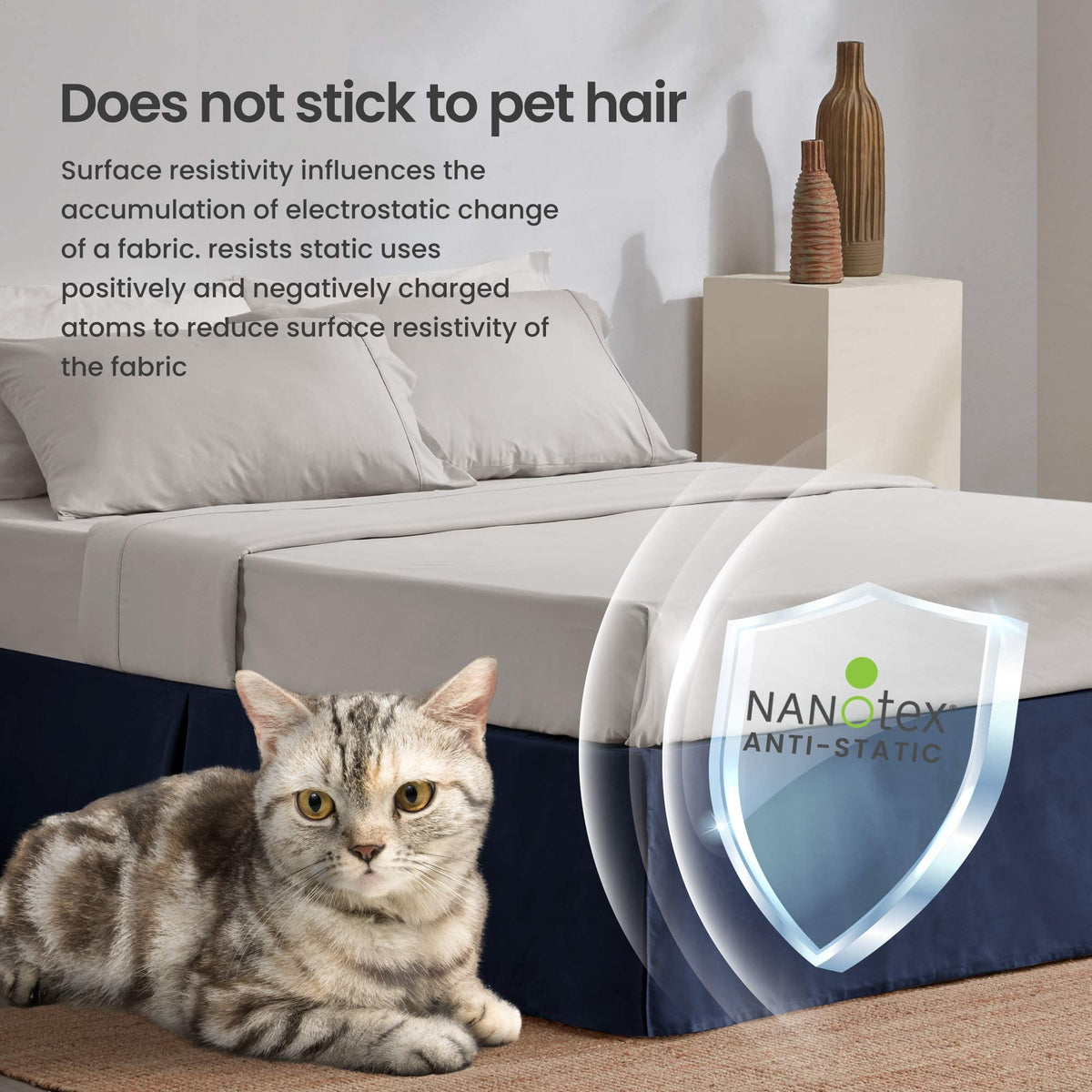 Q: How does the anti-static technology work in this bed skirt?A: The SLEEP ZONE Bed Skirt features advanced NANOTEX static-resistance technology that effectively blocks dust, pet hair, and other impurities from adhering to the fabric, helping to keep your bedroom clean.