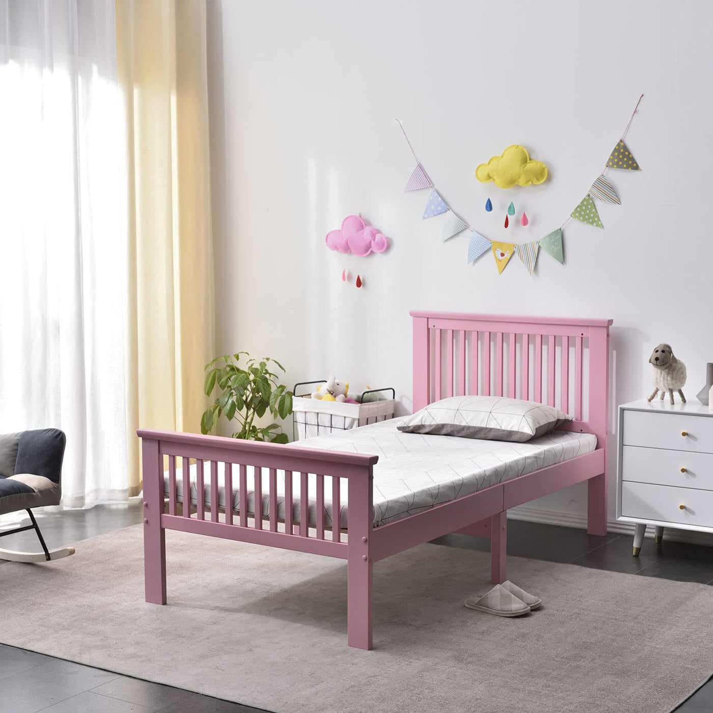 Twin Solid Wood Platform Bed with Headboard/Pine Twin Bed (Pink)