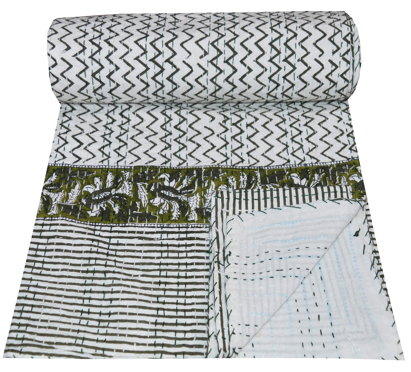 V Vedant Designs Twin Size Hand Block Print Kantha Quilt Throw Indian Handmade Bedding Bedspread Quilt