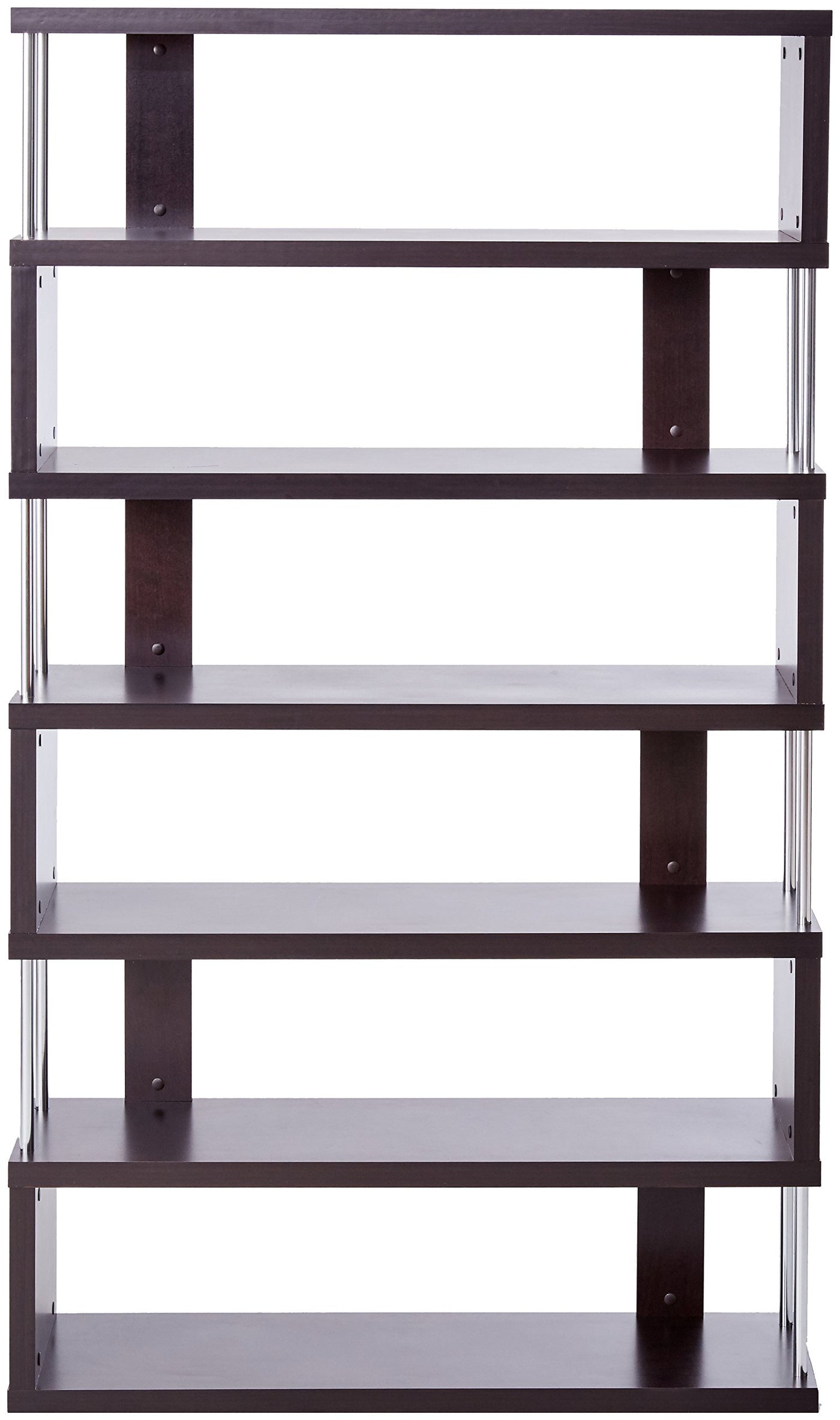 This artsy, modern bookcase gets you organized with style. Our Barnes Bookcase is made of dark brown faux wood grain paper veneer over and engineered wood frame and features chromed steel side supports. Not only does this modern display shelf house books, but it is also the perfect place to show off your prized vases, décor and home accents. The Barnes Bookcase is Malaysian-made, requires assembly and should be dry dusted. Separately offered is the Barnes Bookcase with three shelves. Dimensions: 75.2 Inch high x 43.3 Inch wide x 11.4 Inch deep.
