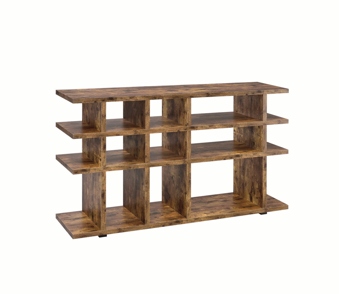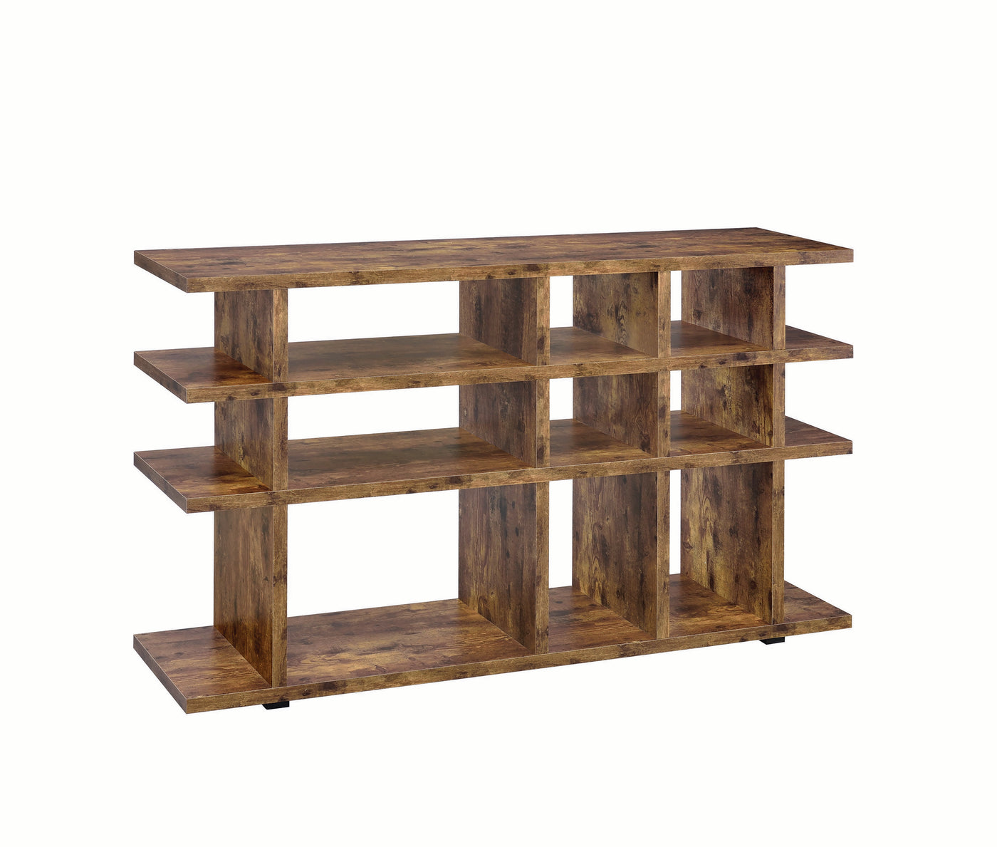 Liven up the look of a living room or home office. This handsome bookcase features a contemporary silhouette with a touch of rustic charm. Nine open shelves of various shapes and sizes provide plenty of room to display an extensive book collection. An antique nutmeg finish infuses its modern design with traditional appeal. Constructed from high-quality materials, this bookcase is as sturdy as it is stunning.