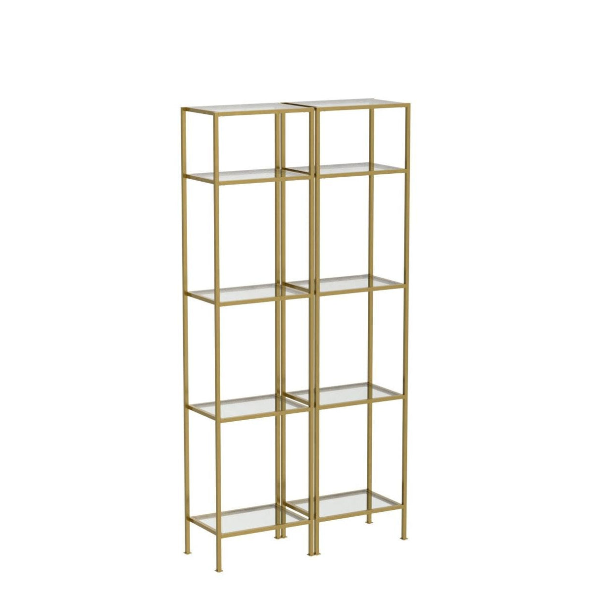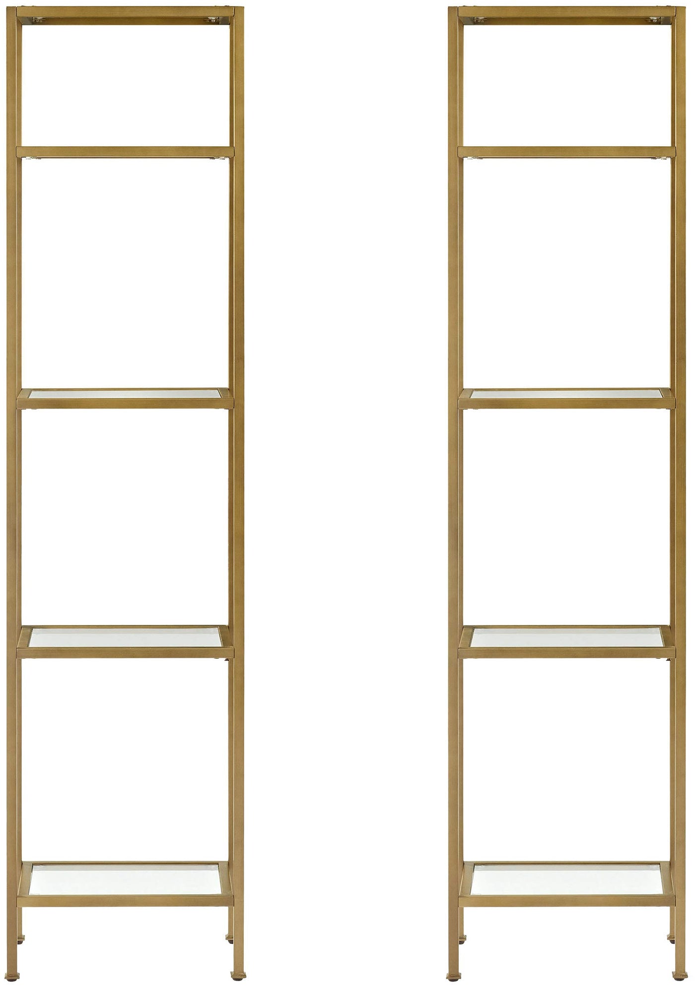 Stylish And Modern, The Aimee 2 Piece Étagère Set Is An Eye-Catching Addition To Any Home. With A Sturdy Yet Sleek Steel Frame, The Aimee Étagère Set Can Be Paired With A Variety Of Décor. The Open, Tempered Glass Shelves Of The Étagères Are Perfect For Display And Organization Without Overwhelming The Room.