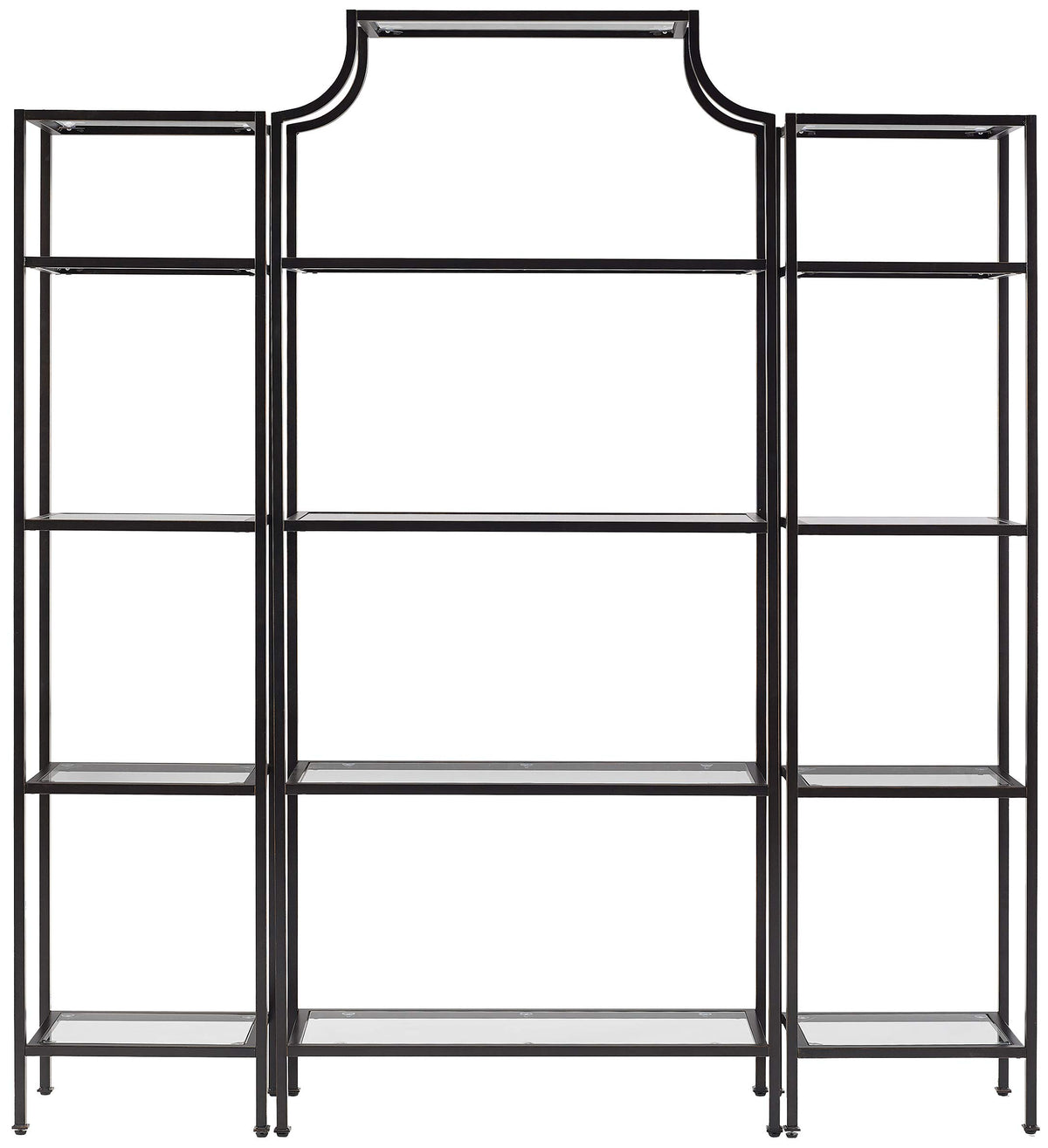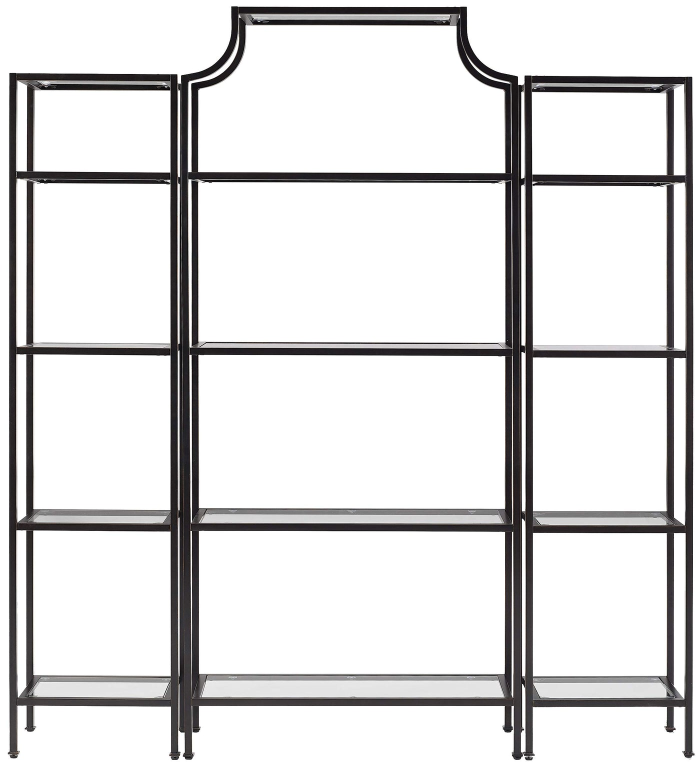 Stylish and modern, the Aimee Étagère Set is an eye-catching addition to any home. A sturdy steel frame with pagoda-styling creates visual interest that can be paired with a variety of décor. The Aimee Étagère’s open, tempered glass shelves are perfect for display and organization without overwhelming the room.