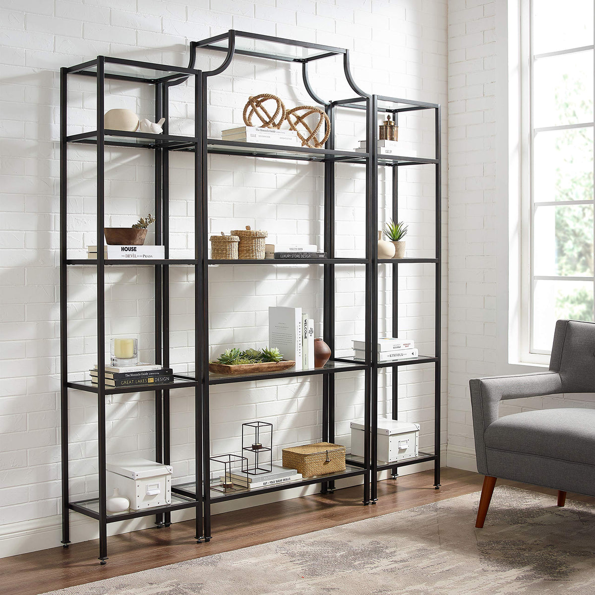 Crosley Furniture Aimee 3-Piece Bookshelf Set with Glass Shelves, Bookcase Storage, Oil-Rubbed Bronze