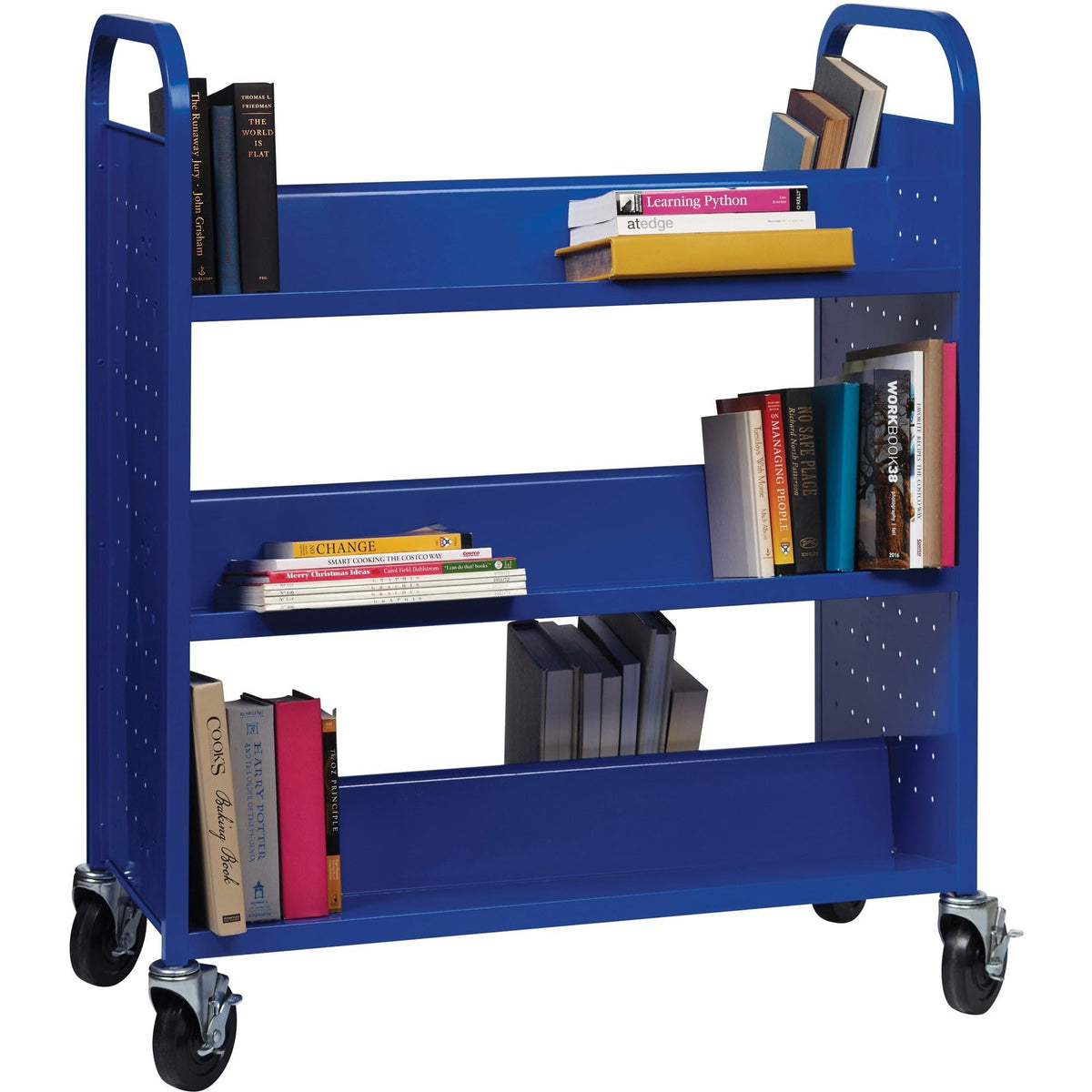 Double-Sided Book Cart Offers A Total Of Six Slanted Shelves Where You Can Organize And Transport Plenty Of Books And Other Items. The Opening Between Each Shelf Measures 12". Sturdy Design Features Smooth, Rounded Handles For Easy Maneuverability And Perforated End Panels For Style And Better Air Circulation. Cart Moves Easily On 5" Casters That All Lock For When You Need The Cart To Stay Put. Welded Steel Construction Provides A Long-Lasting, Durable Product.