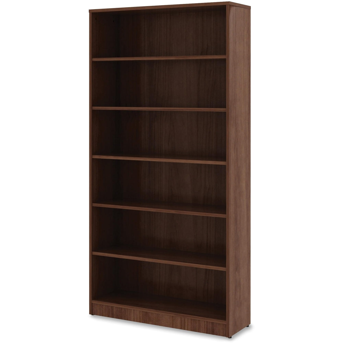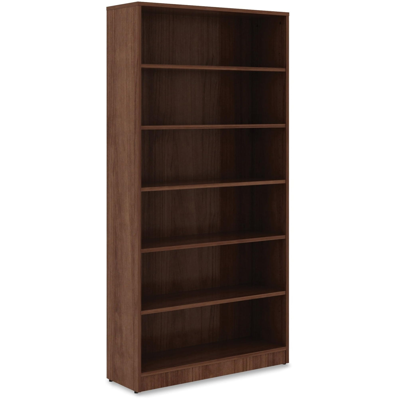 Sturdy, six-shelf bookcase offers high-quality laminate construction and a contemporary design. Shelves are 3/4" thick and made of 18mm thick, medium-density fiberboard with thermally fused, Walnut laminate for long-lasting use. The visible, one-piece backing behind the shelves is made with 3mm thick, medium-density fiberboard and matching laminate. Both sides are finished. Bookcase features five adjustable shelves, one fixed bottom shelf, square edges and adjustable feet. Each shelf holds up to 75 lb.