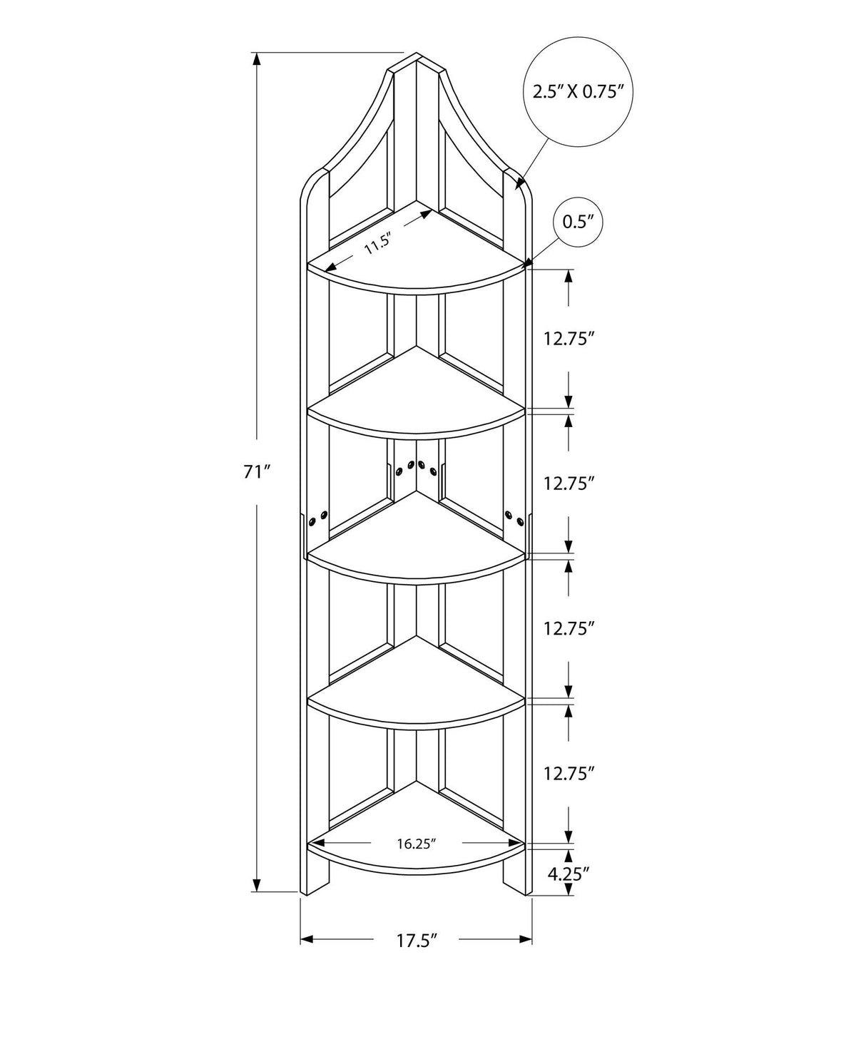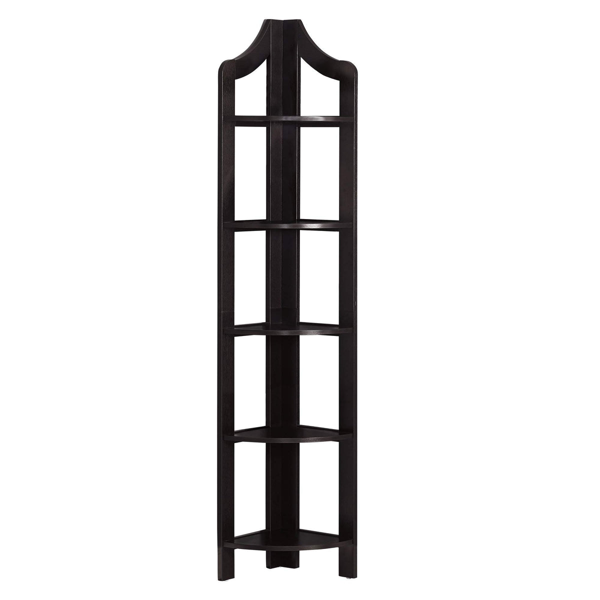 Fill that empty corner space in your hallway, living room, or bedroom with this elegant corner style étagère bookcase. Offering plenty of storage space with 5 fixed wedge style shelves to place books, pictures, plants, or showcase your decorative objects. The transitional design of this eager is suitable for any décor and the compact size makes it ideal for small spaces without sacrificing style. Tipping hardware is included to affix to a wall for further stability. Assembly is required.