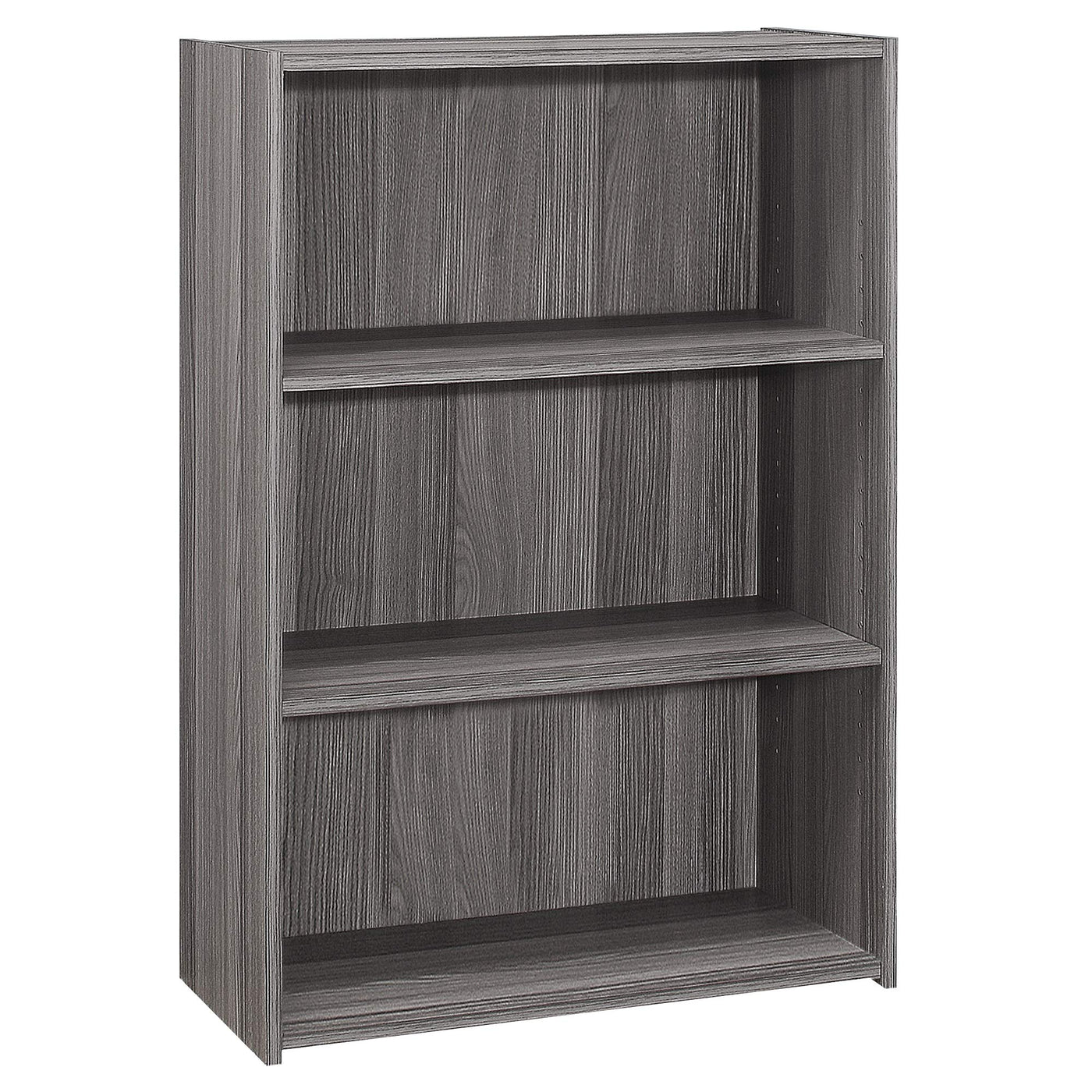 This 3-shelf bookcase in a simple, clean and space-saving design makes it a versatile storage option for any room in your home. The solid adjustable shelving allows for various sized objects to be displayed in your own creative way. Constructed from engineered materials in a sophisticated grey wood-look laminate finish, this transitional style bookcase could be used in an entryway to store all your shoes, or in a living room, home office, or bedroom to place books, toys, and decorative objects. Assembly is required.