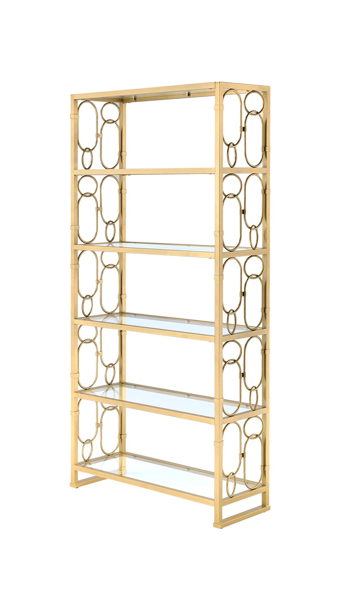 The Julos open bookcase finished in a trendy gold, and unique circle decorative design on sides. Use this to keep books, picture frames, and other momentos. Features five spacious clear glass shelves for storage and display. This bookcase is pefect fit for any room in your home. Some assembly required.