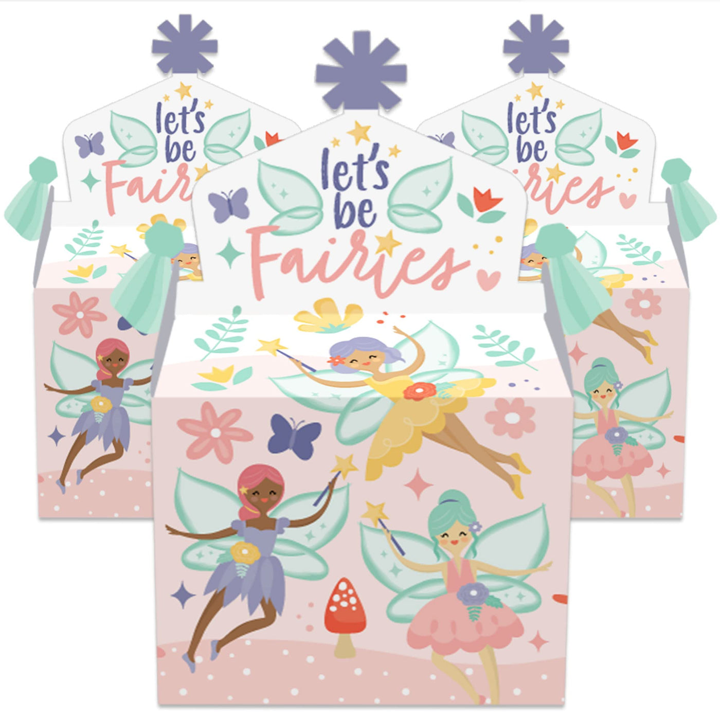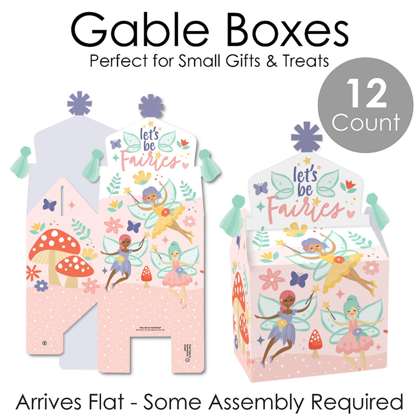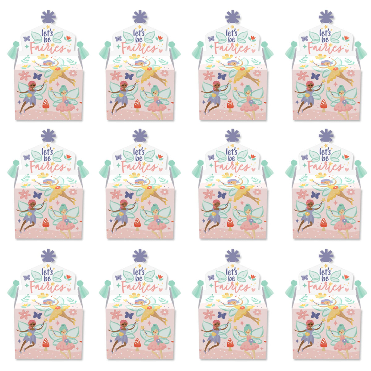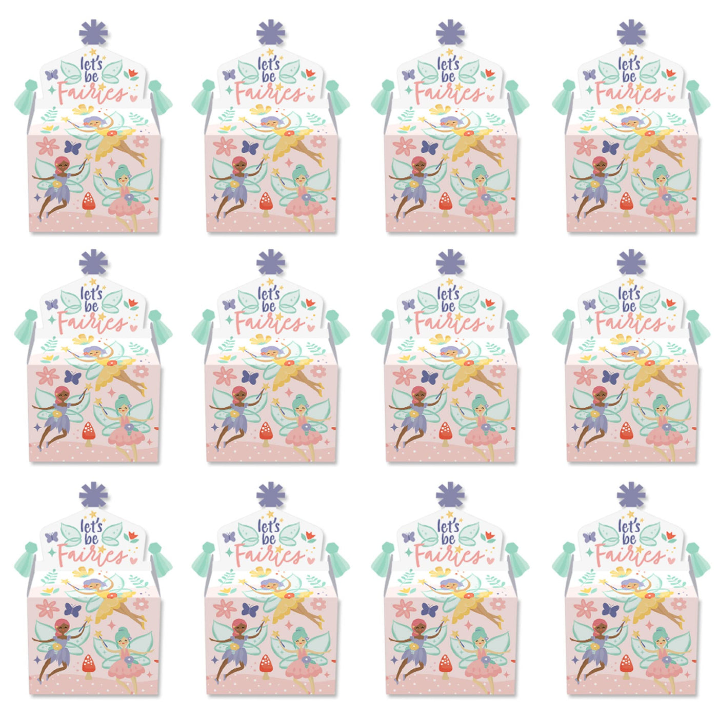 Q: How many gable boxes are included in the set?A: Each set includes 12 Let’s Be Fairies-themed goodie party favor boxes.