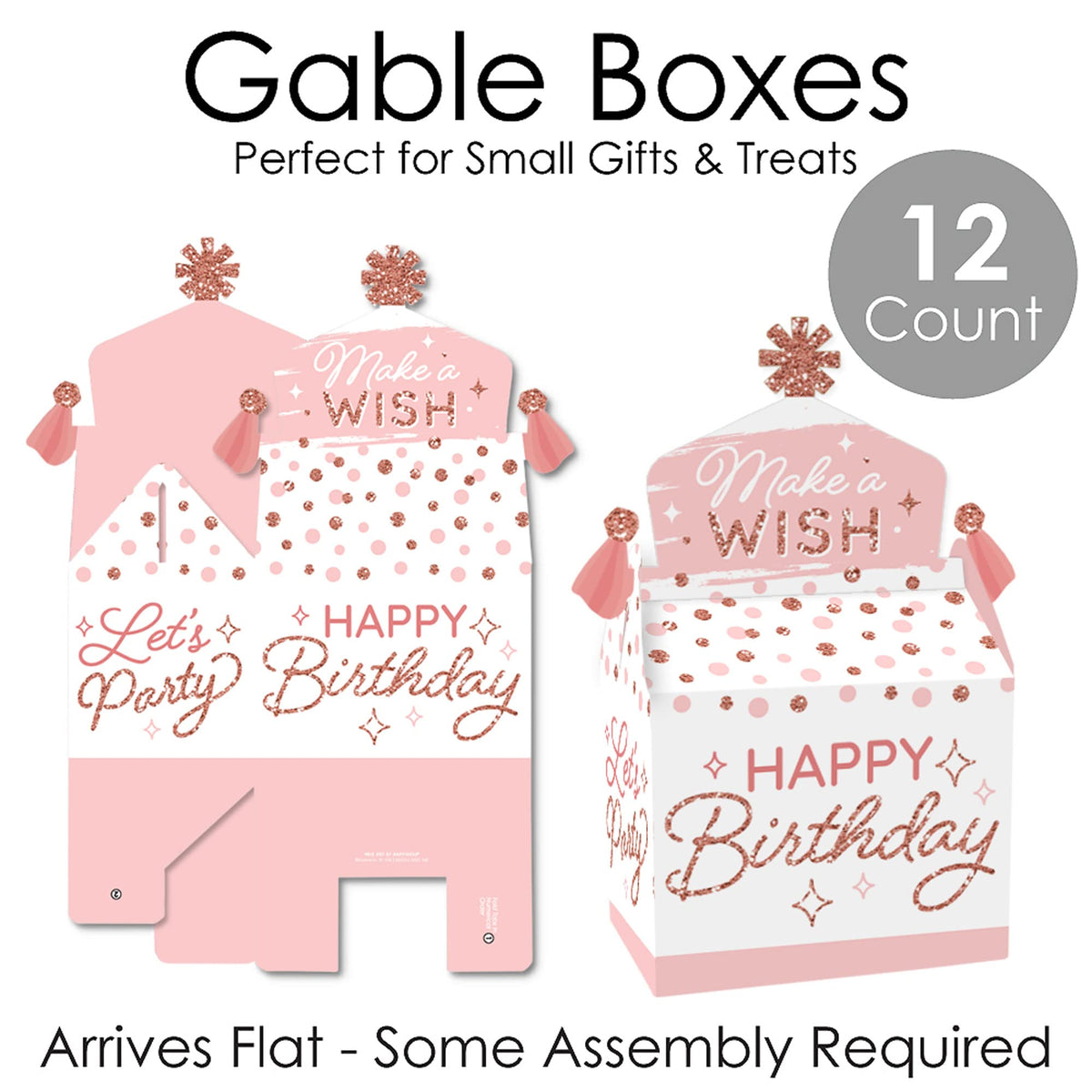 Q: How many gable boxes are included in a set?A: The set includes 12 Pink Rose Gold Birthday-themed gable boxes, ideal for party favors at birthday celebrations.