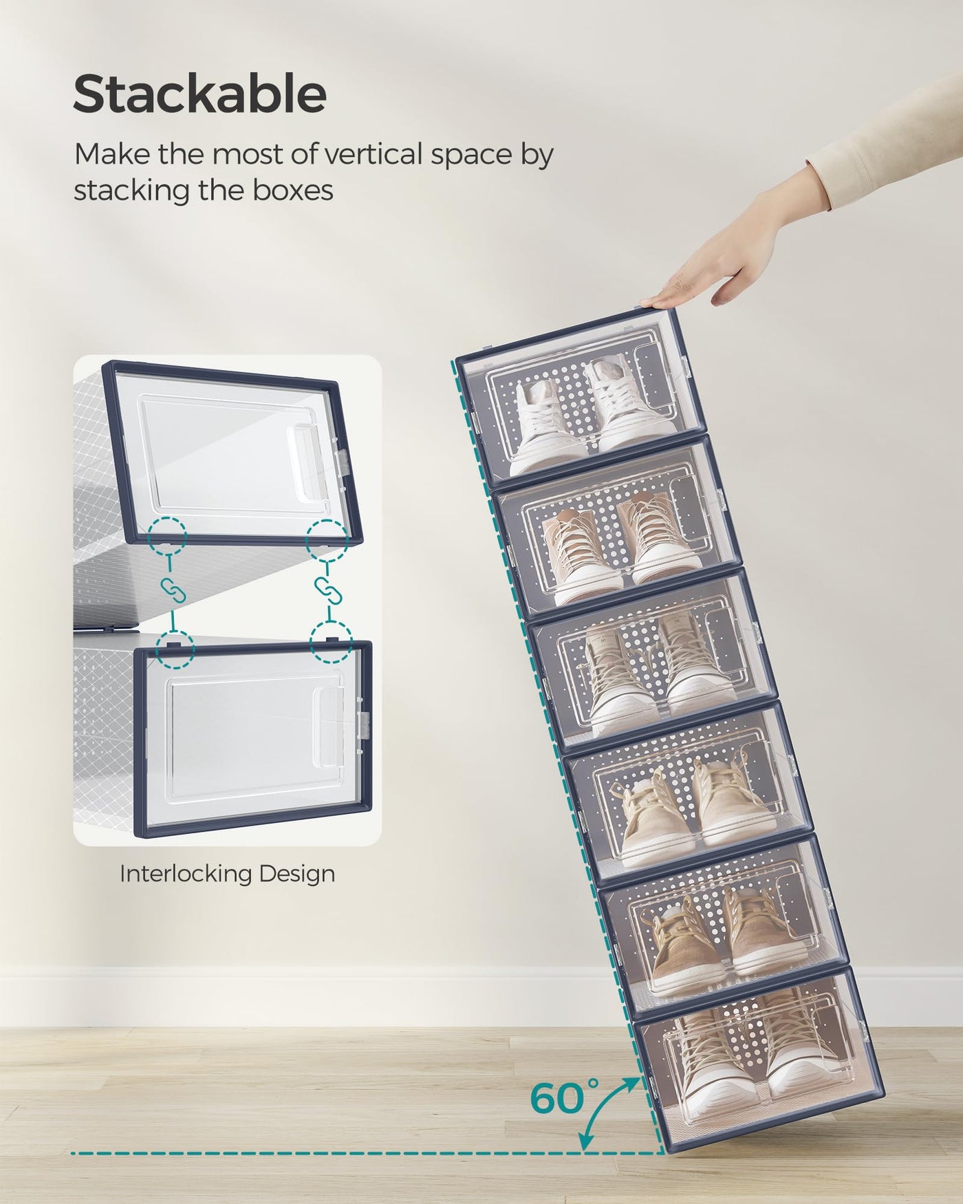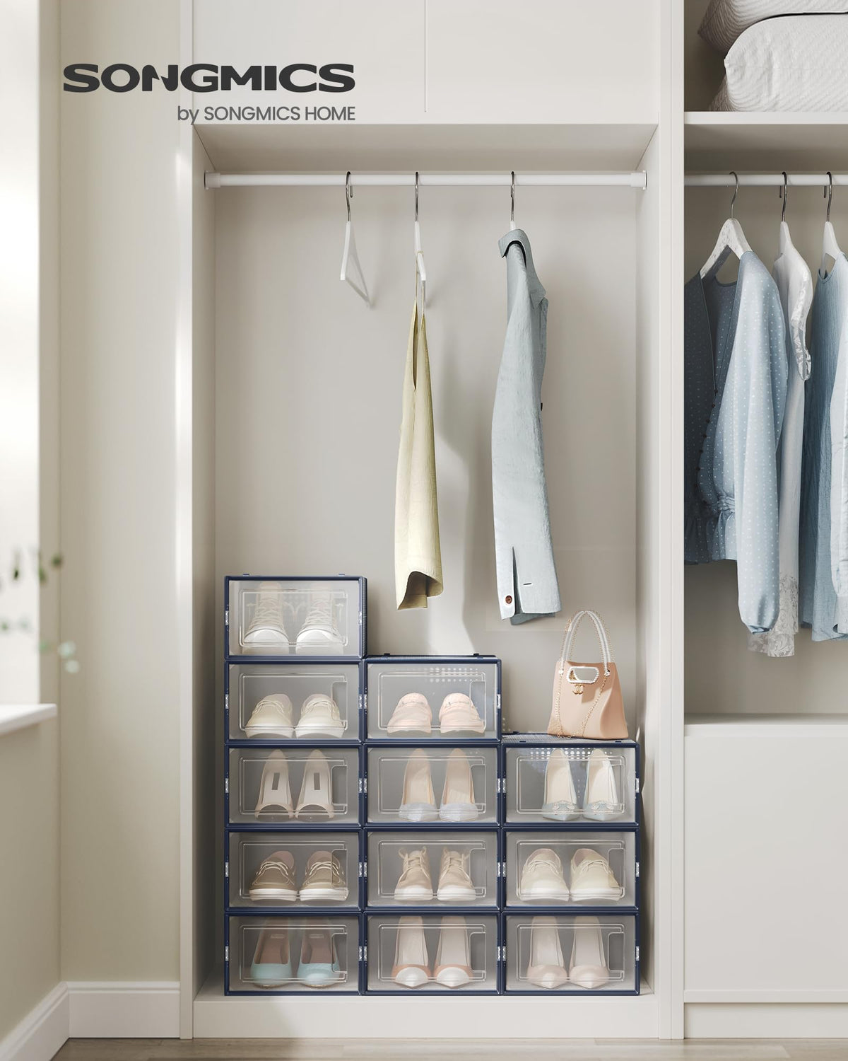 Songmics Shoe Boxes, Pack Of 12 Shoe Storage Organizers, Stackable Clear Plastic Boxes For Closet, Sneakers, 9.1 X 13.1 X 5.6 Inches, Fit Up To Us Size 11, Transparent And Charcoal Blue Ulsp12Sb30