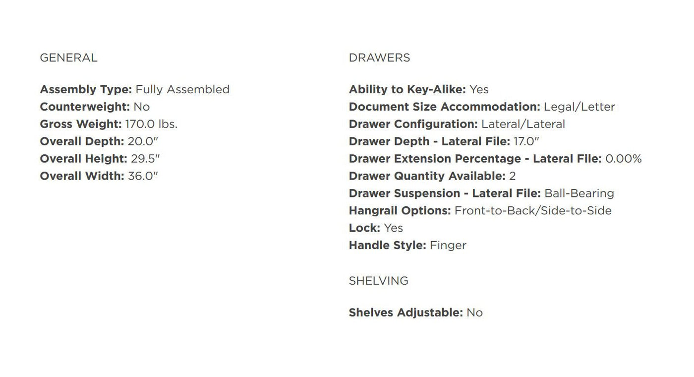 Hon 10563 Durable, Scratch-Resistant Laminate Surfaces. Straight Edges Provide A Clean, Streamlined Look. Drawers Extend Fully On Steel Ball Bearing Suspensions. Hang Rails For Letter- And Legal-Size Hanging Files. Features: -Color: Mahogany. -Drawer Configuration: Lateral. -Drawer Quantity: 2. -Warranty: Lifetime. -Made In The Usa. Dimensions: -29.5" H X 36" W X 20" D, 170 Lbs. Finish: Mahogany