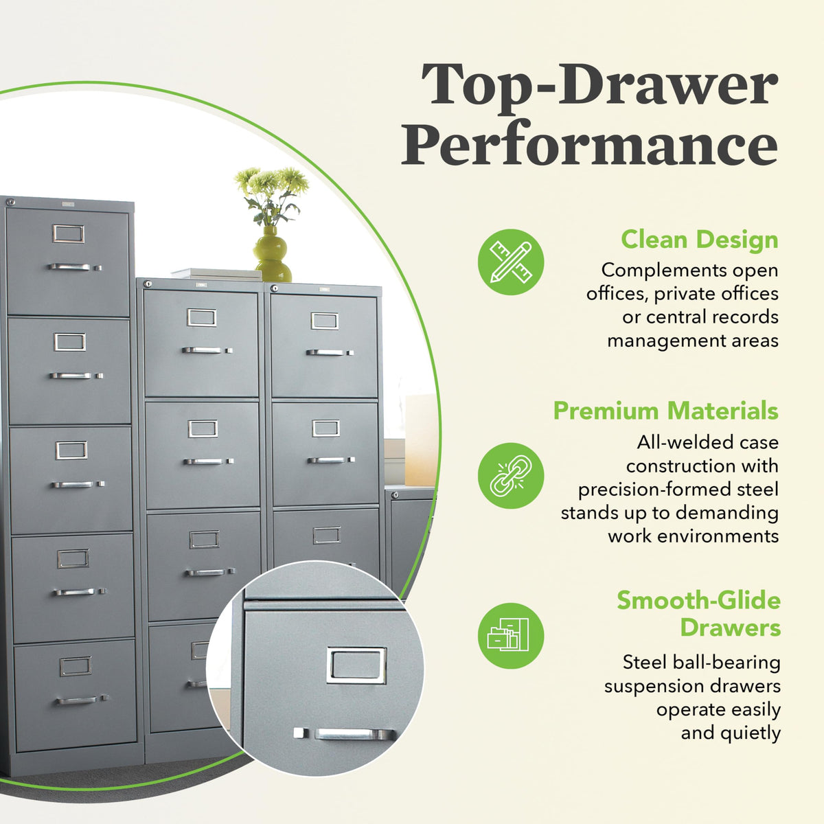 310 Series Vertical File, 5 Letter-Size File Drawers, Putty, 15" X 26.5" X 60"Thumb Latch Keeps Drawers Safely Closed.Label Holders For Quick And Easy Identification Of Contents.Hon "One Key" Core Removable Locks.