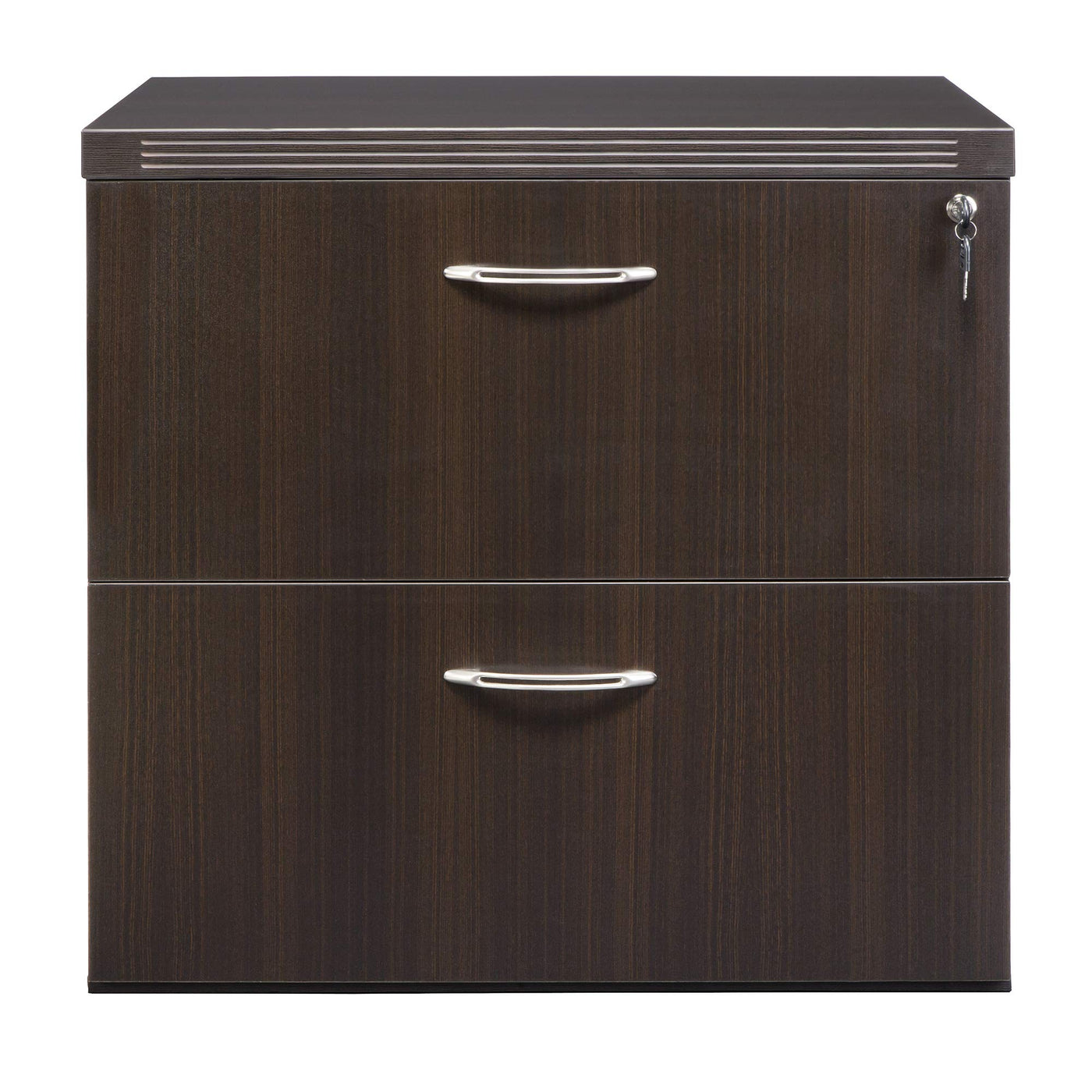 Aberdeen Series freestanding lateral file slides easily under almost any work surface and features a finished top. Two drawers hold either letter or legal sized files and can support up to 150 lbs. each. Drawers open with curved metal pulls with brushed nickel finish. File is locking and keyed alike. Complements all Aberdeen Series Furniture.