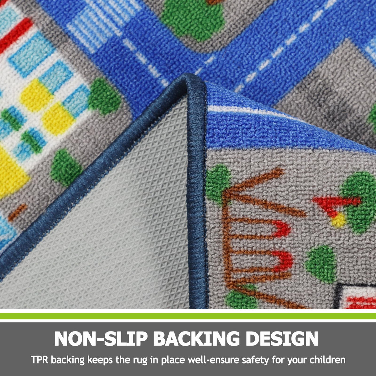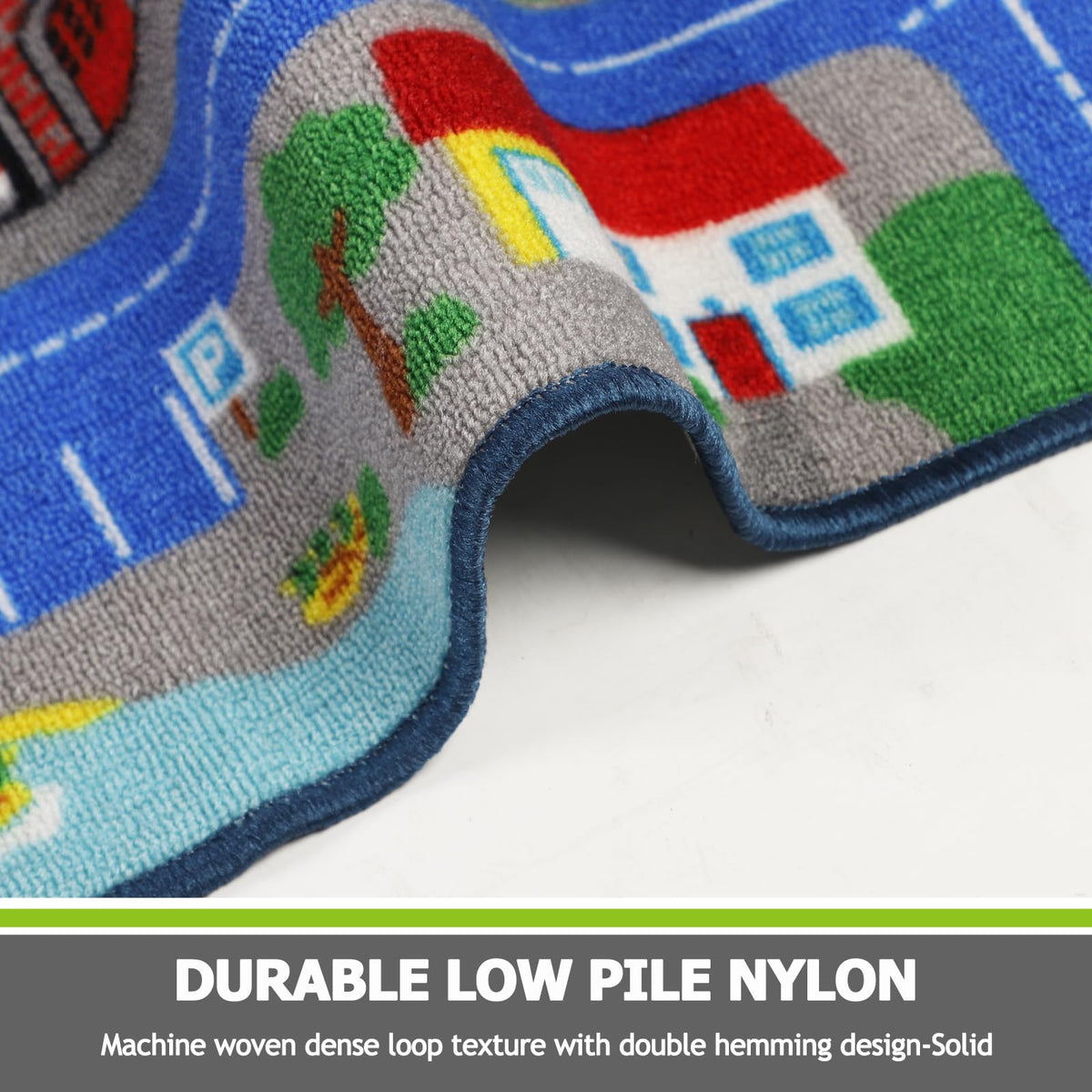 Q: What features does the traffic road design offer for children's learning?A: The rug features various patterns such as a police station, school, hospital, and more, providing children an engaging way to learn about different community places while they play.