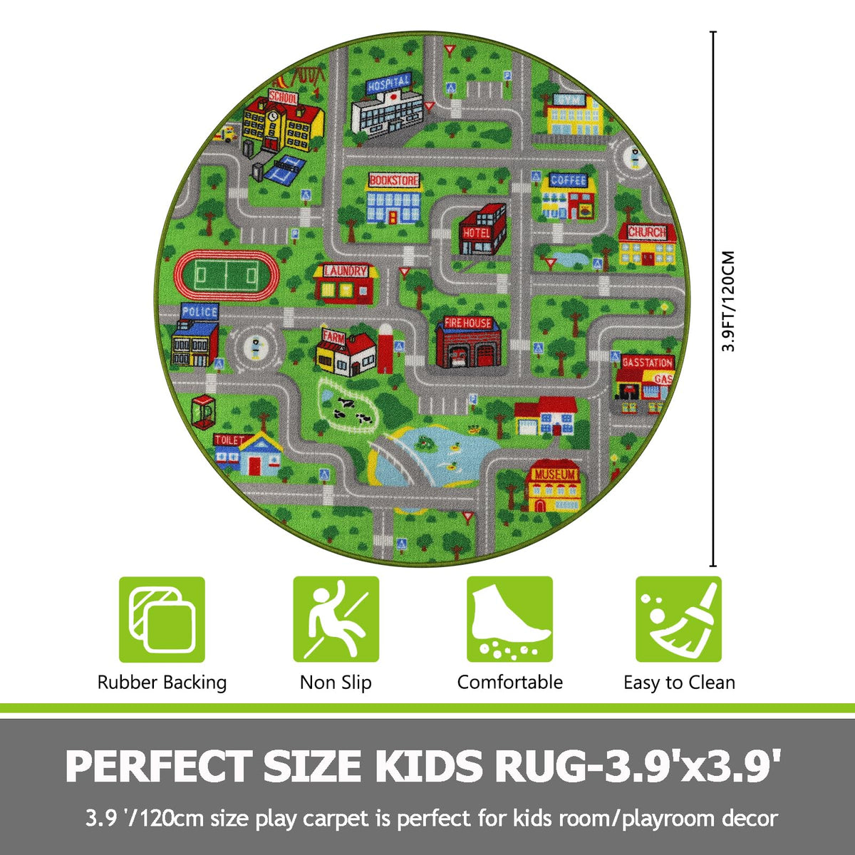 Q: What are the dimensions of the Capslpad Green Car Road Kid Rug?A: The Capslpad Green Car Road Kid Rug measures 4 feet by 4 feet (120x120 cm), making it an ideal size for kids to play without bumping into each other.