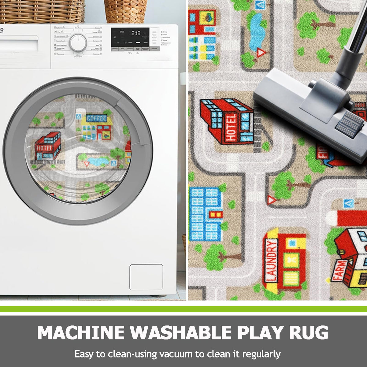 Q: Can multiple children play on this rug at the same time?A: Yes, the spacious design allows 2-3 children to play simultaneously without crashing their toy cars, making it ideal for playdates and group activities.