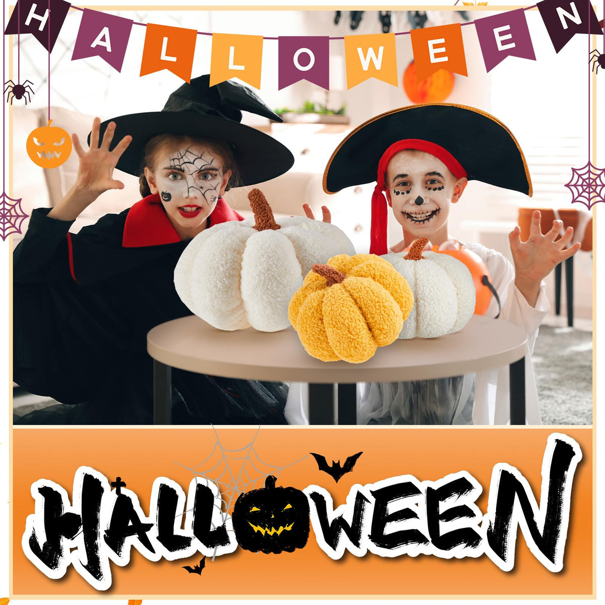 Q: What sizes are the Juexica Halloween Stuffed Pumpkin pillows?A: The Juexica Halloween Stuffed Pumpkin pillows come in different sizes. The white pillows measure approximately 28 x 28 x 17 cm (11 x 11 x 7 inches), while the yellow and white pillows are approximately 18 x 18 x 10 cm (7 x 7 x 3.5 inches).