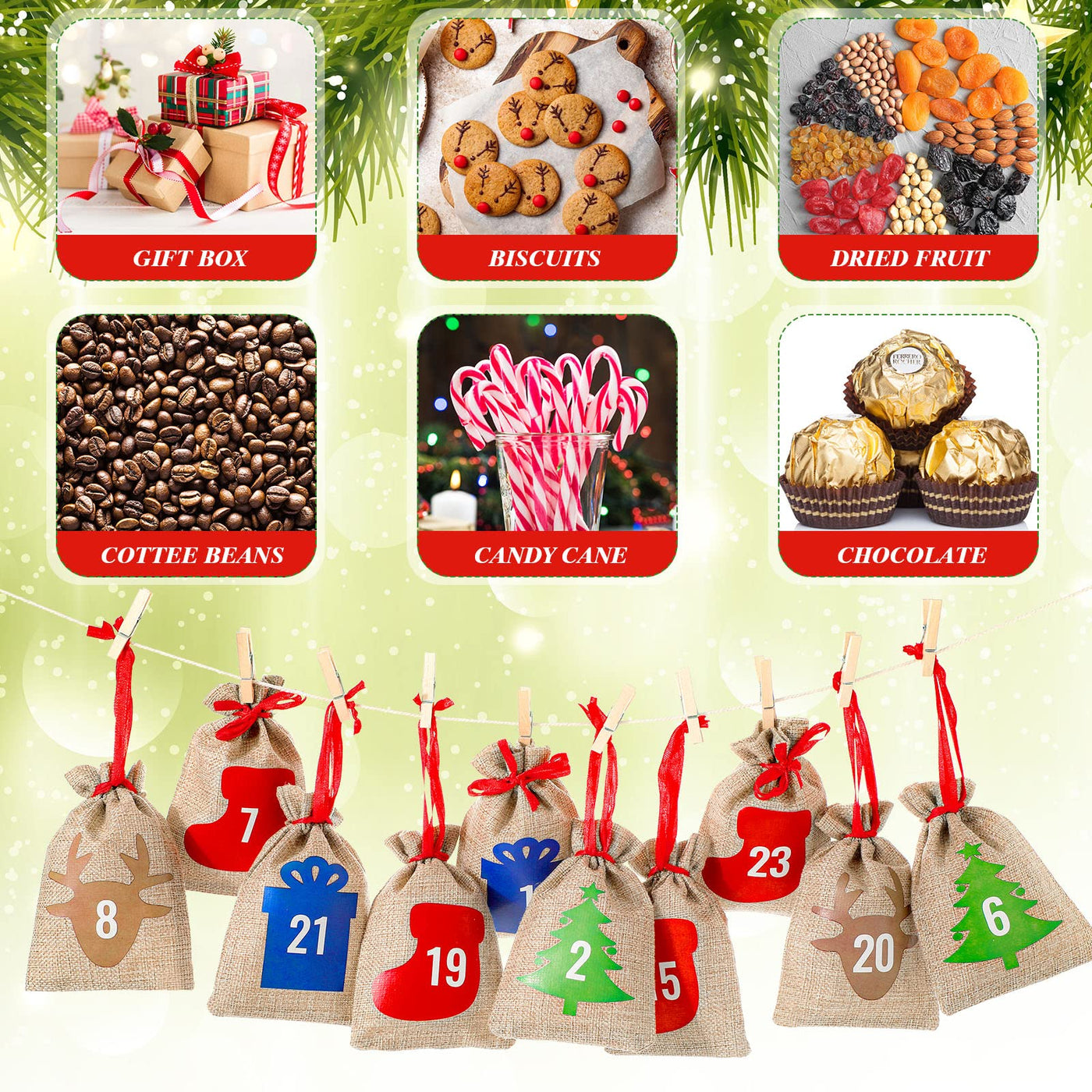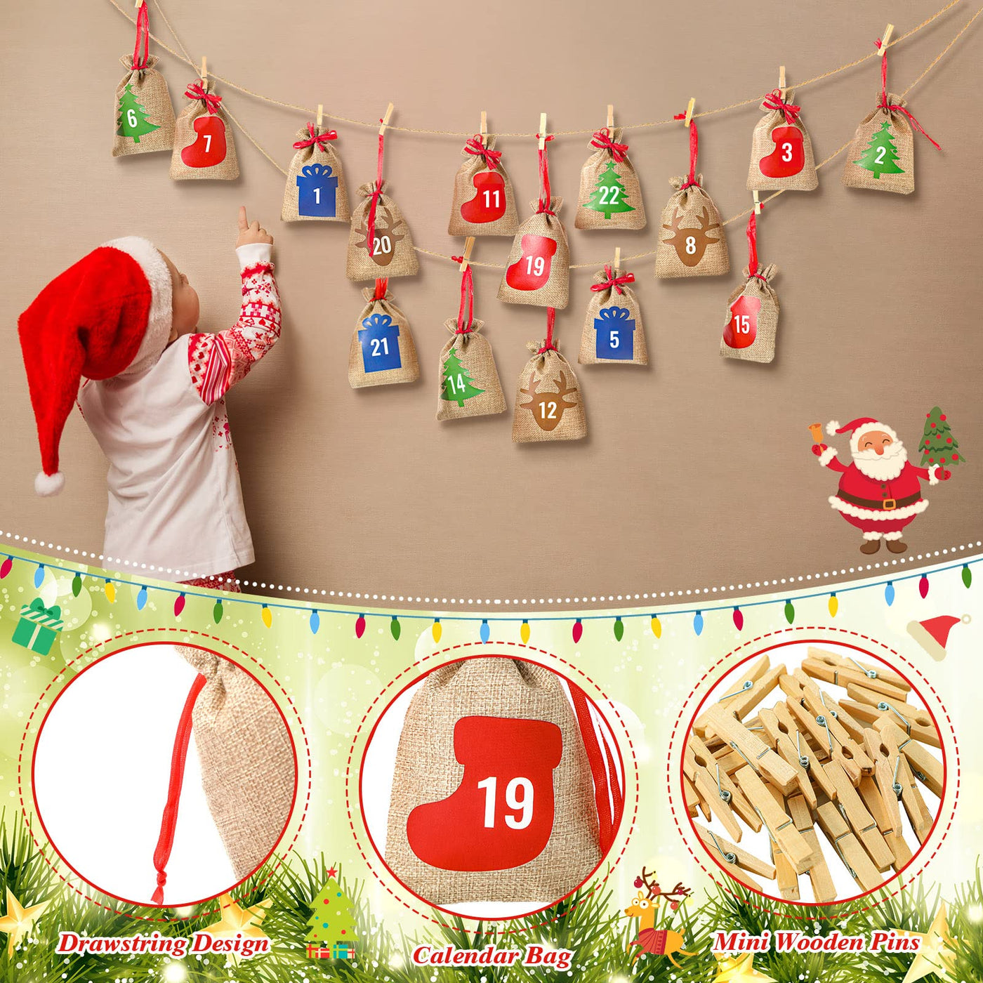 Features: Christmas Countdown Settings: Our Empty Advent Calendars Can Be A Kind Of Interesting Countdown Way To Welcome Christmas, Which Can Also Help Increase Your Expectation For Holiday, As Each Number Bag For Each Day Can Bring Cozy And Surprising Feelings.Practical And Ornamental: You Can Apply The Fillable Advent Calendars To Mark The Coming Of Any Meaningful Days, And Apply The Bag To Hold Small Items, Such As Candy, Gifts, Keys, Confetti, Seeds And Any Other Items, Not Only Decorating Your Christmas, But Also Making Convenience For Daily Life. Specifications: Main Material: Burlap, Woodcolor: As Shown In The Picturessize: As Shown In The Picturespackage Includes: 24 X Advent Calendar Bags24 X Mini Wood Clips1 X Cotton Ropenotes: Manual Measurement, Please Allow Slight Errors On Size. The Color May Exist A Slight Difference Due To Different Screen Displays. Winding Risk May Exist, Please Keep It Away From Kids Under 3 Years Old.